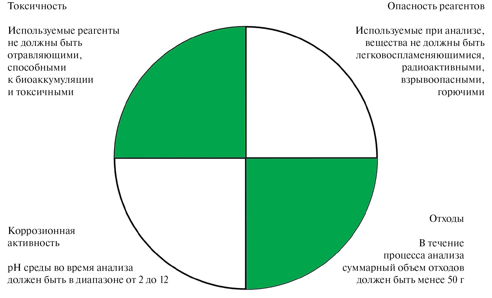 Первоначально методики для составления данной базы были представлены Агентством по охране окружающей среды США (United States Environmental Protection Agency, EPA) и Геологической службой США (United States Geological Survey, USGS). В настоящее время разрешение на включение методики в данную базу может быть получено любыми научными организациями, а также государственными и частными компаниями. Плата за ввод методик не взимается, однако они должны быть оформлены в строго документированном формате и опубликованы (т.е. быть общедоступными). С помощью NEMI пользователь может получить доступ к кратким описаниям методик, а также к полнотекстовому содержанию. Текущие параметры поиска включают аналит (название или номер CAS), тип среды (вода, воздух, почва/осадок или ткань), используемый прибор и детектор (более 80 вариантов), подкатегорию метода (биохимический, органический, неорганический, микробиологический, физический или радиохимический) и др. С точки зрения оценки экологичности в методе NEMI используется простая пиктограмма в виде круга, разделенного на четыре части (рис. 1). Первая четверть круга указывает, что при анализе не используются отравляющие, способные к биоаккумуляции, опасные реагенты и растворители в соответствии с Базой данных по выбросам токсичных веществ (Toxic Release Inventory, TRI) [8]. Вторая четверть подтверждает отсутствие используемых реактивов в списках опасных отходов согласно нормативам Закона о сохранении и восстановлении природных ресурсов (Resource Conservation and Recovery Act, RCRA) [9]. Третья четверть отвечает за отсутствие коррозионного воздействия, т.е. pH среды находится в диапазоне от 2 до 12. Четвертая часть свидетельствует о том, что суммарный объем получаемых на протяжении всего анализа отходов не превышает 50 г. Если данные критерии выполняются, то соответствующий сектор зеленый, если нет – белый. Это первая попытка получения визуальной оценки экологичности методики. Однако главный недостаток визуализации NEMI заключается в том, что результаты качественные, а источник неэкологичности в явном случае на пиктограмме не отображается [10].