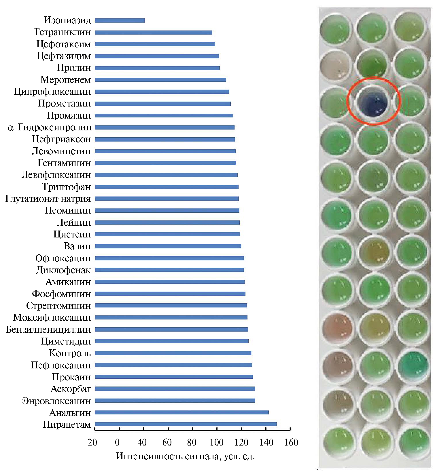 Мешающее влияние посторонних соединений. Некоторые лекарственные вещества оказывают заметное собственное влияние на рассматриваемую индикаторную реакцию (без изониазида, рис. 5, синие столбцы). Это может быть связано с замещением атома хлора в красителе нуклеофильными группами этих лекарственных веществ [17].