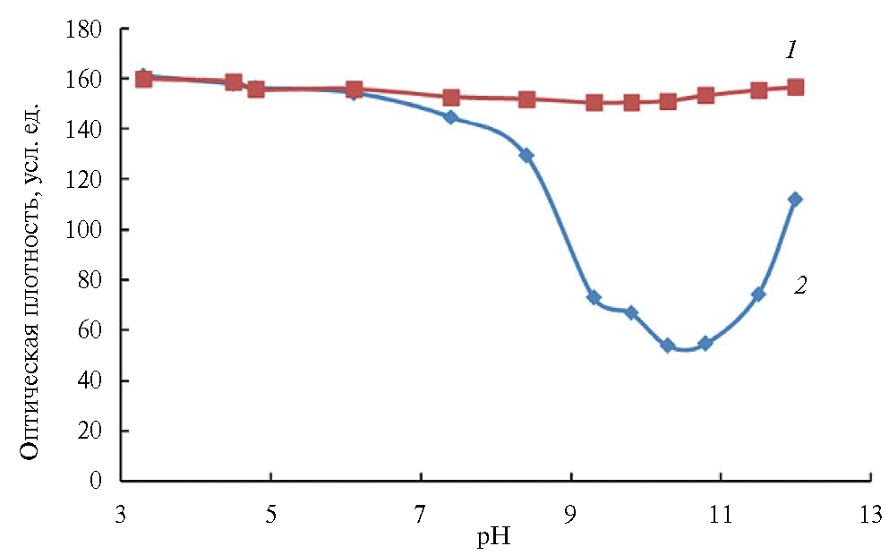 Рис. 6. Зависимость интенсивности флуоресценции в ближней ИК-области спектра для систем краситель–ЦТАБ и краситель–ЦТАБ–изониазид от рН: 1 – в отсутствие изониазида, 2 – в присутствии 1 мМ изониазида. Продолжительность реакции 20 мин.