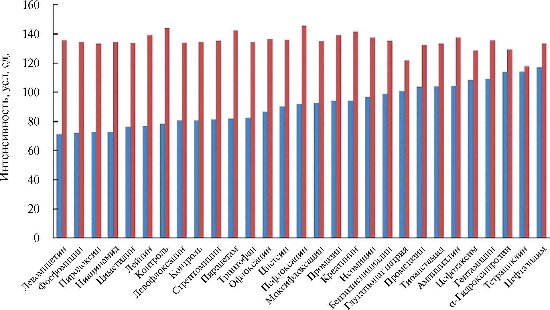 Рис. 5. Влияние лекарственных веществ (1 мМ) в системах краситель–ЦТАБ (синие столбцы) и краситель–ЦТАБ-изониазид (1 мМ изониазид, красные столбцы) на интенсивность зеленого канала. Контроль – системы без мешающих соединений. Продолжительность реакции 20 мин.