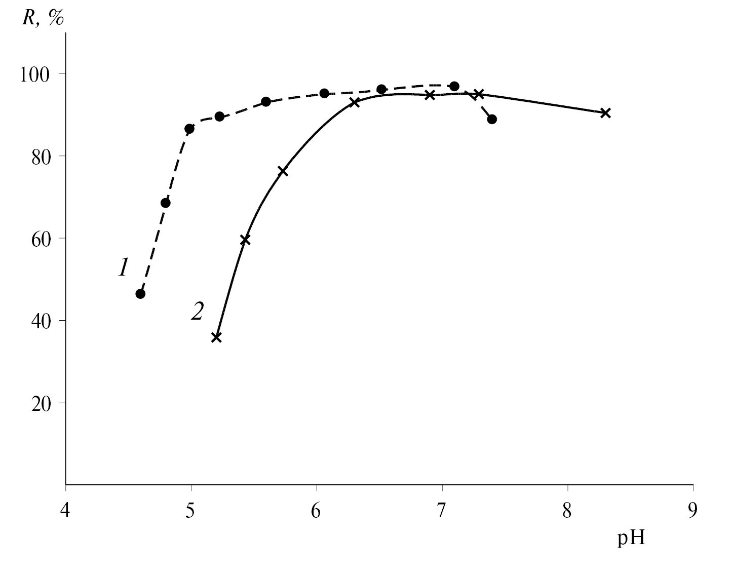 Ранее показано, что N-нонаноил-N'-метансульфонилгидразин (НМГ) образует с ионами цветных металлов малорастворимые осадки. Его применение в качестве собирателя в процессе ИФ обеспечивает получение высокой степени извлечения ЦМ (95−99%) при их совместном присутствии, а также отделение меди от сопутствующих ионов в области значений рН 5−6.5 [20]. Частным случаем селективного выделения меди является разделение меди и цинка. Установили (рис. 1, кривая 2), что исходная концентрация металлов влияет на их индивидуальную флотацию по-разному. Для цинка увеличение его концентрации приводит к более резкому повышению степени извлечения; для меди – к расширению интервала оптимальных значений рН флотации (рис. 2). Коэффициенты распределения металлов, приведенные в табл. 1, указывают на более эффективное извлечение Zn(II) по сравнению с Cu(II). Максимальная степень извлечения для Cu(II) составила: 96.7% (рН 6.5−7.0) при сисх 12.3 мг/л и 97.8% (рН 6.0−7.0) при сисх 46.1 мг/л; для цинка – 97.7% (рН 8.4−9.1) и 99.5% (рН 8.6–9.4) при сисх 14.8 и 41.0 мг/л соответственно.