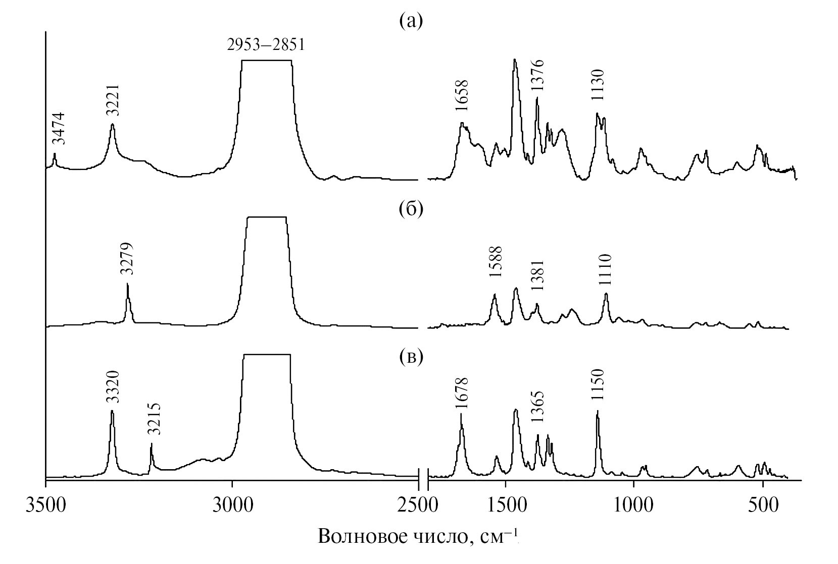 Рис. 3. ИК-спектры собирателя (а) и сублатов Cu(II) (б) и Zn(II) (в).