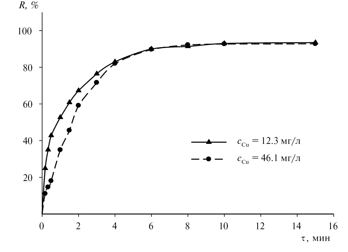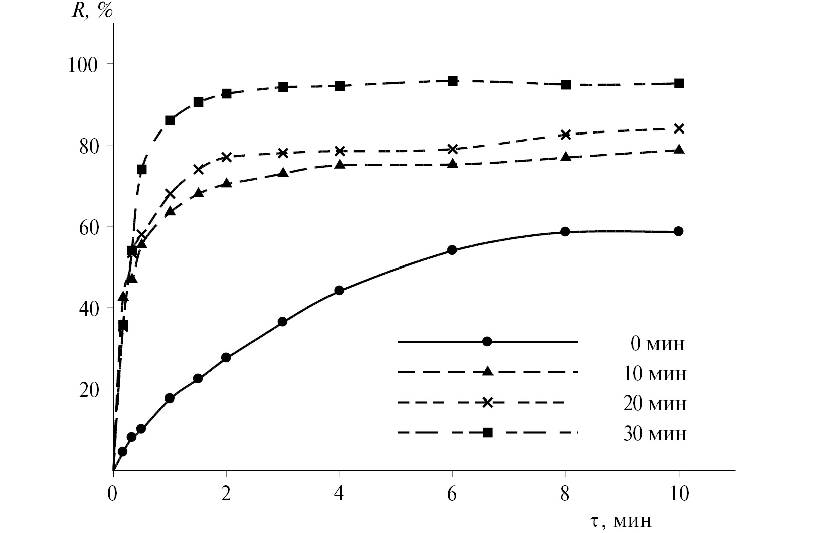 Рис. 6. Кинетика ионной флотации Cu(II) в зависимости от времени кондиционирования. cCu(исх) = 46.1 мг/л, [Cu] : [НМГ] = 1 : 2, рН 6.2−6.8.