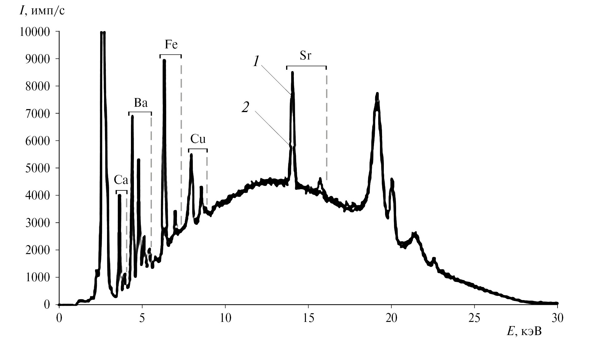 Оборудование. РФА-измерения выполняли на рентгенофлуоресцентном энергодисперсионном спектрометре EDX3600 (Skyray, США). Параметры: напряжение 40 кВ, ток 1000 мА, время экспозиции 40 с. Работали с наиболее чувствительными спектральными линиями элементов К-серии для стронция и L-серии для бария [26].