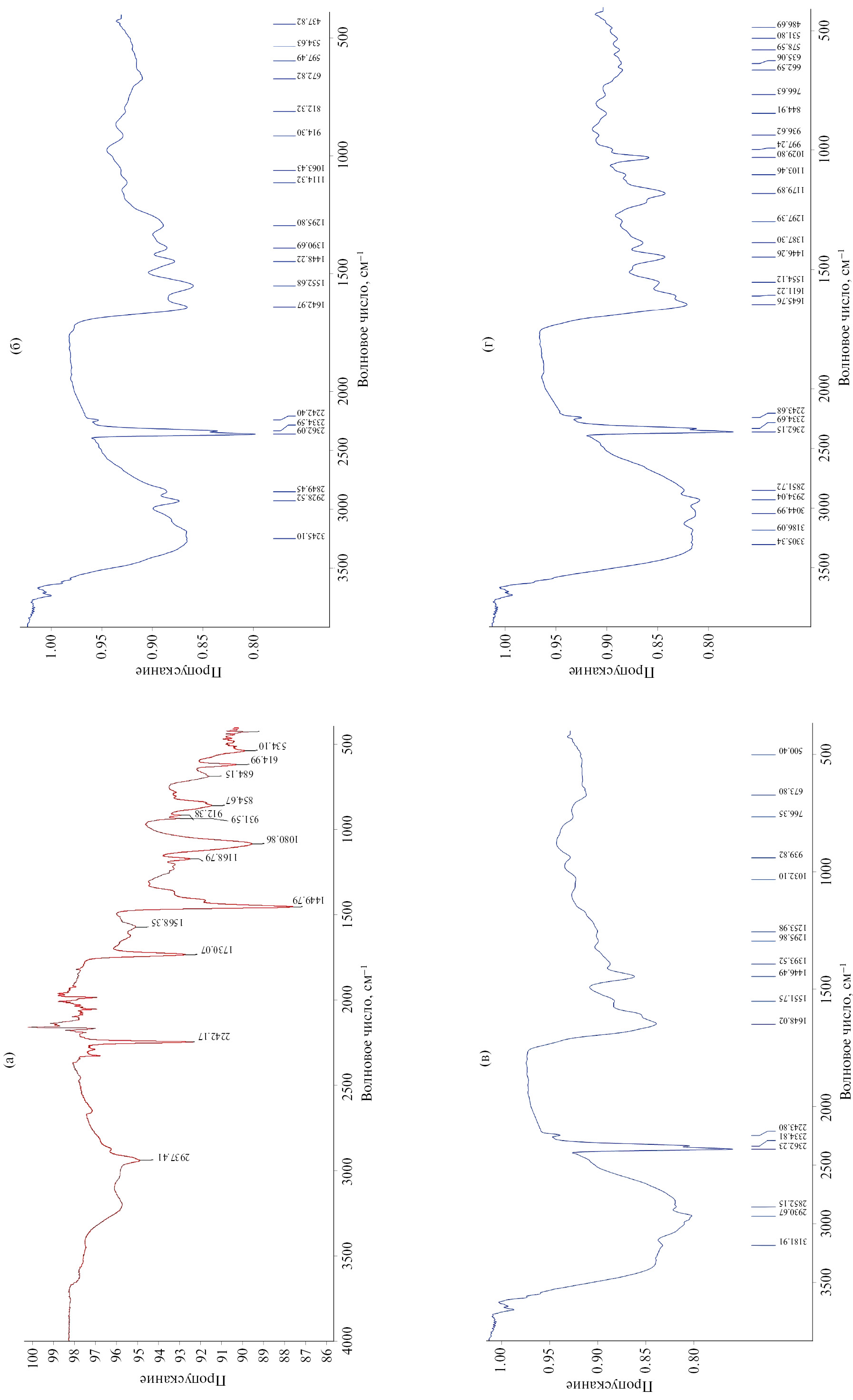Рис. 1. ИК-спектры волокон ПАН (а); ППФ-1 (б); ППФ-1, обработанного HCl (в); ППФ-1 с иммобилизованным тороном (г).