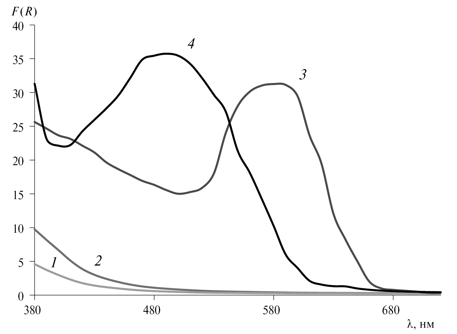 Рис. 3. Спектры диффузного отражения волокон ППA-1 (1), ППФ-1 (2) в отсутствие (3) и в присутствии иммобилизованного торона I (4).