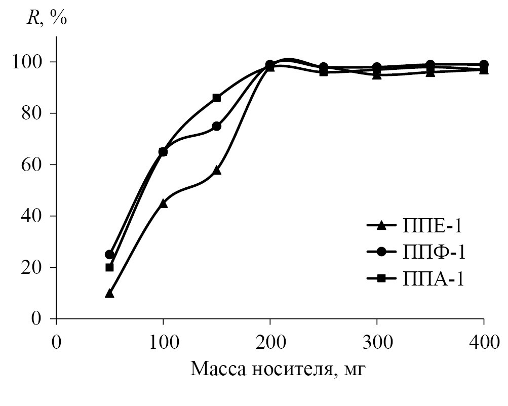 Влияние количества сорбента. Влияние количества волокна и гранул сорбентов с иммобилизованным на них тороном I на сорбцию ионов меди(II) при оптимальных значениях pH исследовали при массе волокна 100−400 мг. Из рис. 6 видно, что количественное выделение меди происходит при массе сорбента 200−300 мг, которую выбрали для последующих исследований.