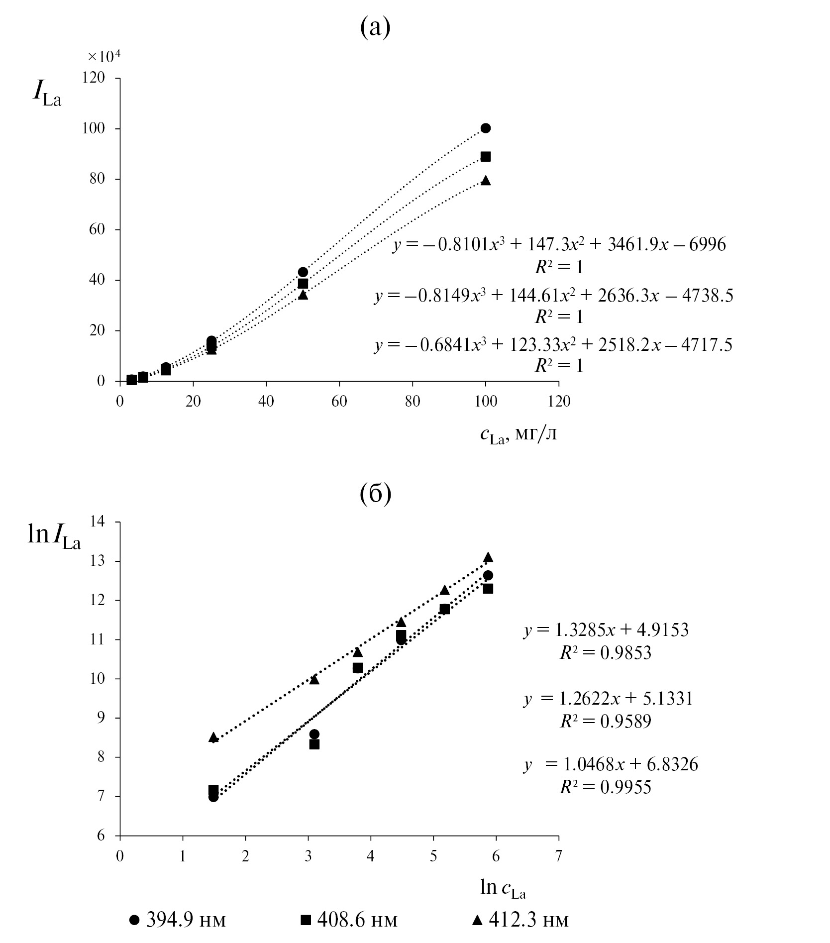 Известно, что некоторые элементы в АЭС–МП демонстрируют ограниченный диапазон линейности в координатах интенсивность/концентрация, в частности, к ним относятся и РЗЭ. В качестве примера на рис. 1 приведены зависимости интенсивности различных линий лантана от его концентрации в диапазоне 3–100 мг/л. Видно, что они имеют S-образный вид (рис. 1а) и не аппроксимируются удовлетворительно ни в прямых, ни в логарифмических координатах (рис. 1б), чаще всего предлагаемых программным обеспечением (ПО) спектрометров. Таким образом, для аппроксимации с удовлетворительной точностью (R2 > 0.999) требуется использовать дополнительное ПО, что усложняет процедуру анализа.