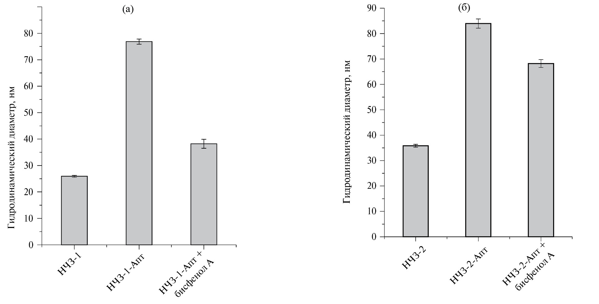 На рис. 4 показаны изменения гидродинамического диаметра наночастиц золота при модификации аптамером, а также после взаимодействия с бисфенолом А. Средние значения диаметра для НЧЗ-1 составили 25.9±0.4 и 76±1 нм до и после модификации аптамером. Такое значимое возрастание объясняется способностью аптамера гидратироваться диполями воды и увеличением гидратной оболочки [35]. Инкубация НЧЗ-1-Апт с бисфенолом А привела к снижению гидродинамического диаметра до 38±2 нм, что связано с десорбцией аптамера и уменьшением степени гидратации поверхности. Для НЧЗ-2 средние диаметры составили 35.8±0.6 и 84±2 нм до и после модификации аптамером. Взаимодействие НЧЗ-2-Апт с бисфенолом А привело к некоторому уменьшению диаметра до 68±2 нм.