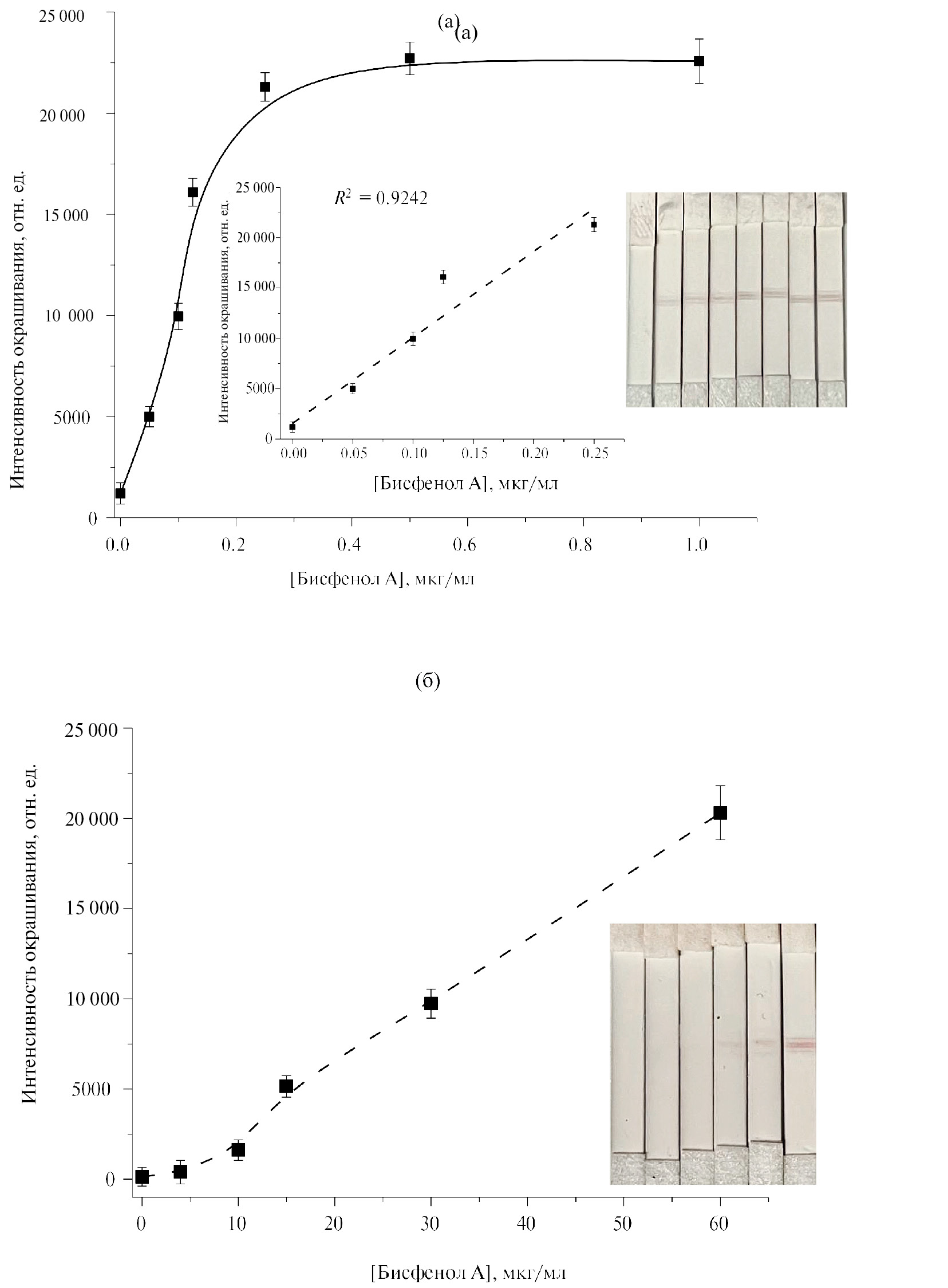 Оптимизация условий определения бисфенола А. Для достижения минимального предела обнаружения бисфенола А оптимизированы условия мембранного хроматографического анализа, включая выбор концентрации коньюгата БСА–МЯК, наносимого на рабочую мембрану, и продолжительности предварительной инкубации с целевым аналитом.