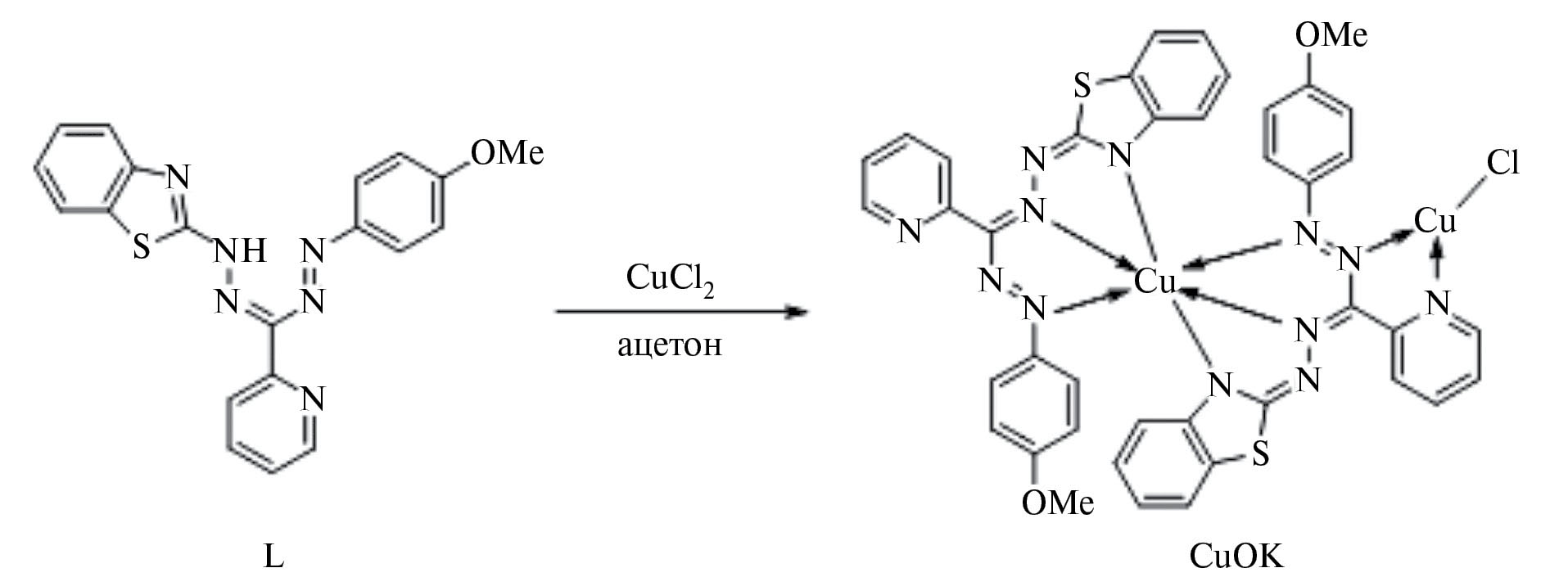 Методика эксперимента. Синтез формазаната меди. 1-(Бензо[d]тиазол-2-ил)-3-(2-пиридил)-5-(4-метоксифенил)-формазан (L) синтезировали по описанной ранее методике [19]. Формазаны являются NH-кислотами и легко образуют комплексы с ионами металлов [15]. Комплекс с медью синтезировали кипячением формазана с хлоридом меди(II) в ацетоне (схема 2).