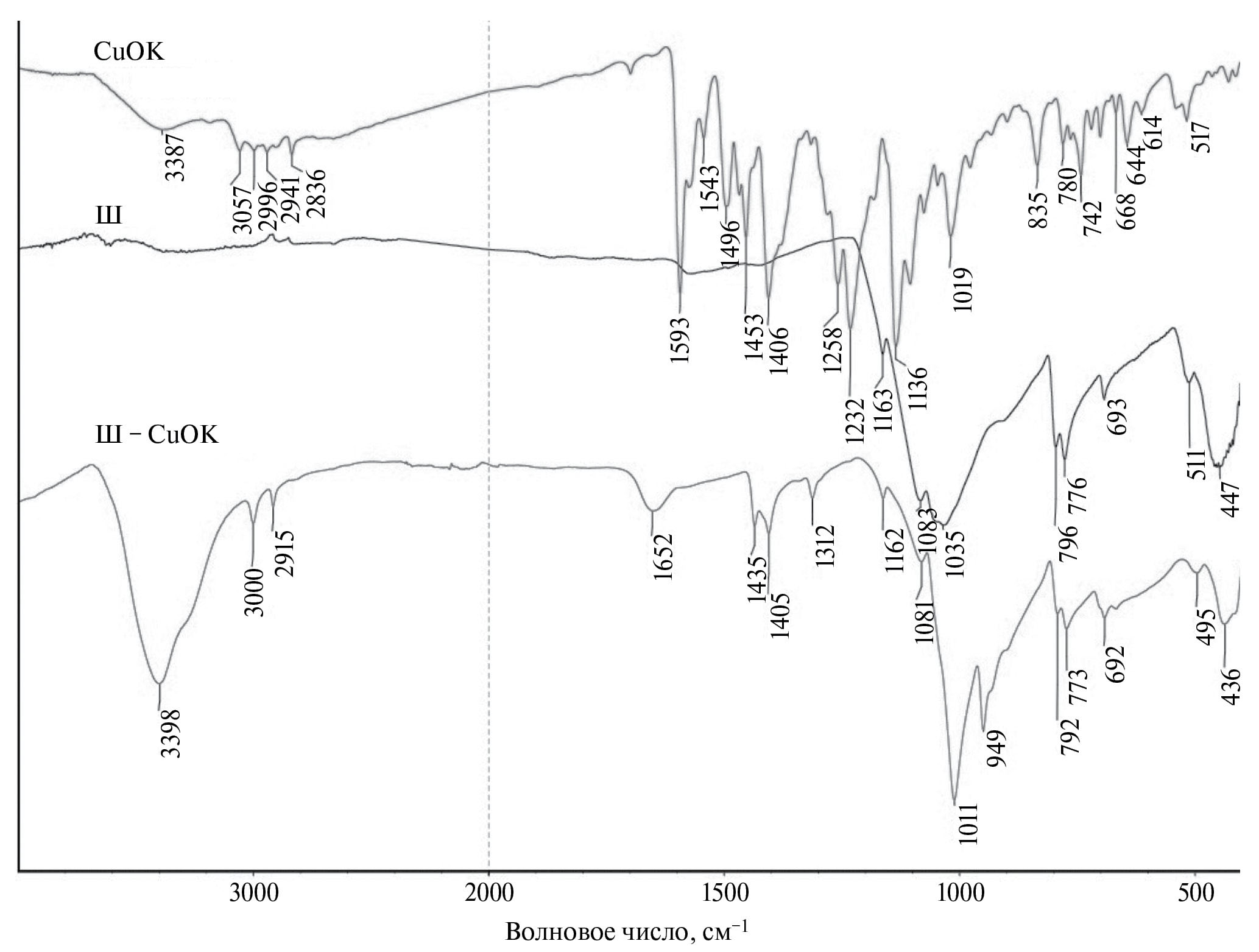 Рис. 1. ИК-спектры формазаната меди (CuOK), шунгита (Ш) и композита Ш-CuOK.