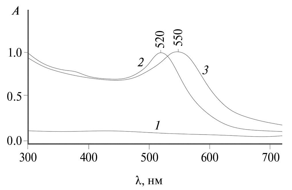 Рис. 2. Спектры светопоглощения в видимой и УФ-областях в бидистиллированной воде (1) НЧAu (2) и конъюгатов IgG@НЧAu (3).