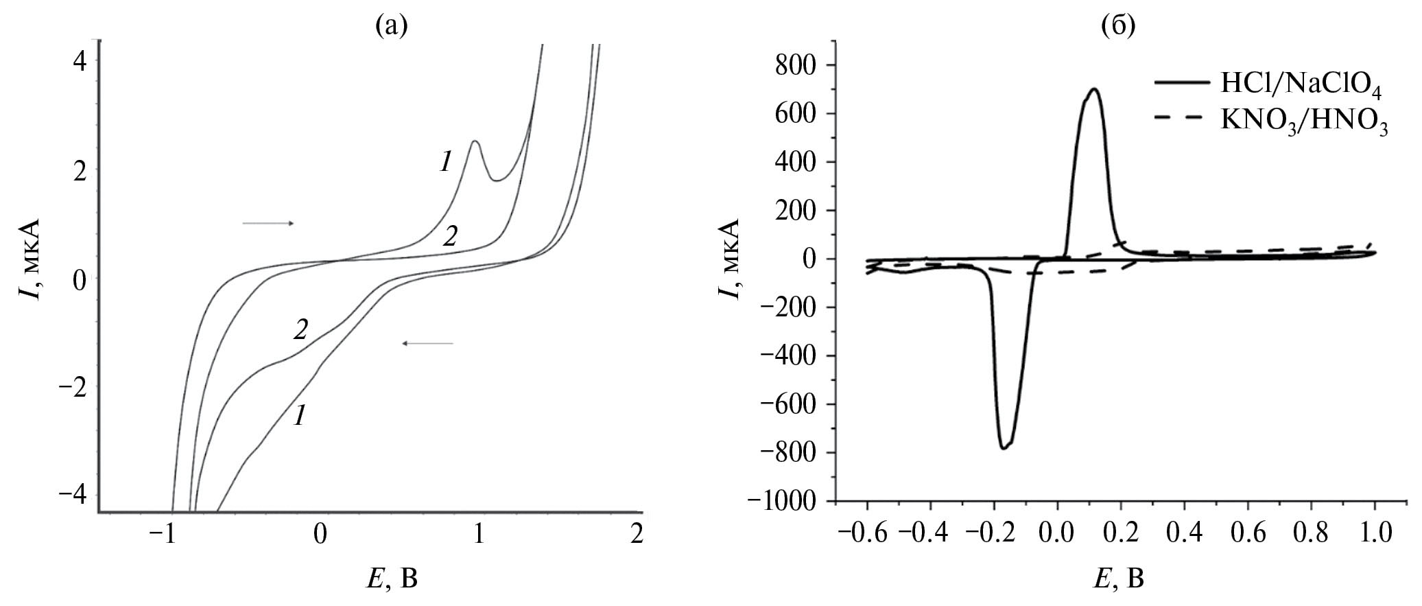 Рис. 4. Циклические вольтамперограммы (а) НЧAu конъюгатов IgG@НЧAu на углеродсодержащем планарном печатном электроде в 0.1 М растворе фонового электролита HCl–NaCl (1 : 1, по объему), v = 100 мВ/с, до иммобилизации рецепторного слоя (1), после иммобилизации рецепторного слоя (2); (б) циклические вольтамперограммы серебра после проявления на поверхности электрохимического иммуносенсора в разных фоновых электролитах: 1 – 0.05 М HCl–0.05 М раствор NaClO4 (1 : 1), 2 – 0.25 М раствор KNO3–0.5 М HNO3 (1 : 1), объем фонового электролита – 200 мкл.