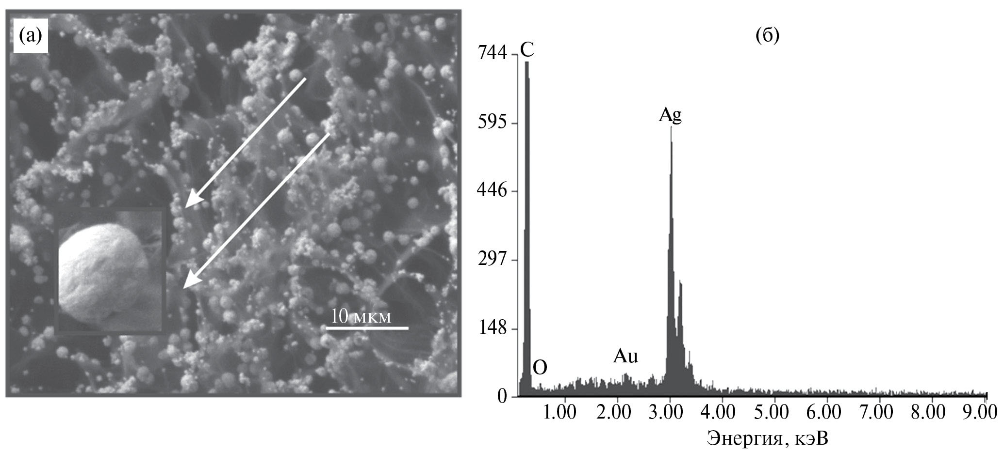 На рис. 5 представлено полученное методом сканирующей электронной микроскопии (СЭМ) изображение поверхности иммуносенсора после каталитического восстановления серебра на НЧAu конъюгатов IgG@НЧAu смесью 0.2%-ной лимонной кислоты и 0.25%-ного метола, а также полученный методом энергодисперсионной рентгеновской спектроскопии (ЭДС) спектр поверхности иммуносенсора после каталитического восстановления серебра с характерными рентгеновскими линиями C, O, Au и Ag. На рис. 5а отчетливо видны крупные сферические образования на поверхности иммуносенсора после восстановления серебра. На ЭДС-спектре (рис. 5б) присутствуют характеристические рентгеновские линии С, О, Au и интенсивная линия Ag, что подтверждает наличие серебра на поверхности иммуносенсора после его каталитического восстановления.