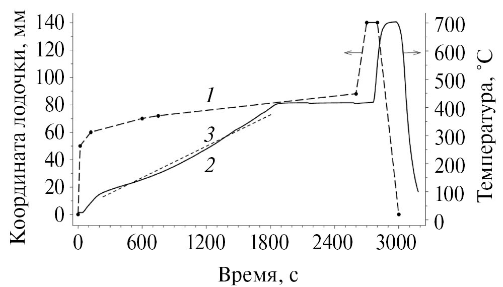 Предлагаемый вариант нагрева образца отличается от традиционных схем нагрева, неподвижно размещенных внутри печи. Нагрев в градиентной печи позволяет избежать систематических погрешностей, которые возникают при транспортировке продуктов разрушения органического вещества. Систематические погрешности могут появиться из-за сорбции органических продуктов разрушения на холодных поверхностях при их транспортировке от места нагрева до места конверсии, где эти продукты превращаются в летучие газы (СО2 и Н2О). Очевидно, что продукты разрушения должны транспортироваться в потоке газа с температурой выше, чем температура нагрева исследуемого образца. Перемещение лодочки с образцами с помощью шагового двигателя можно организовать с высокой точностью и тем самым вводить пробу в различные температурные зоны реактора. Такой подход позволяет осуществлять как линейный нагрев образцов с небольшим градиентом температуры, так и быстрый нагрев, поскольку теплоемкость лодочки с образцом незначительная.