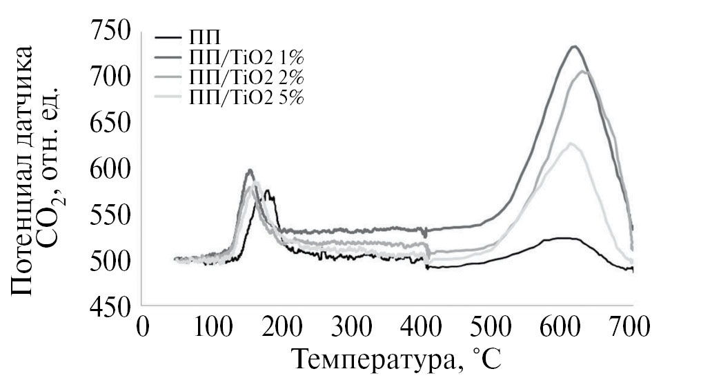 Наличие диоксида титана способствует ускорению реакции окисления в области температур 110–180 °С. На это указывает сдвиг фронта начала окисления исходного полипропилена в область более высокой температуры по сравнению с фронтом для образцов полипропилена, содержащих диоксид титана (см. рис. 5 и 6). Кроме того, скорость окисления углеродсодержащих продуктов конденсации в его присутствии выше. Диоксид титана в области высоких температур исполняет роль катализатора глубокого окисления углеродсодержащих продуктов конденсации. Именно в этой области появляется эффект нестехиометрии, связанный с динамикой кислородной подрешетки. Эффекты, связанные с ускорением процесса окисления, скорее всего, обусловлены особенностями изменения стехиометрии титаноксидных кристаллических фаз. Известно, что оксиды титана относятся к бертоллидам – соединениям с переменной стехиометрией. Кислородная подрешетка диоксида титана в области высоких температур способна к трансформациям в зависимости от парциального давления кислорода и наличия восстановителей в окружающей газовой среде [21]. Кинетический фактор влияет на вид кривой. Это явление лежит в основе работы сенсоров, содержащих оксиды IVB группы периодической системы элементов [22]. В области низких температур подвижность кислорода, приводящая к окислению органических соединений, недостаточна для влияния на общую скорость окисления. С повышением температуры этот запрет снимается, и диоксид титана способен вносить существенный вклад в процесс глубокой деструкции полипропилена.