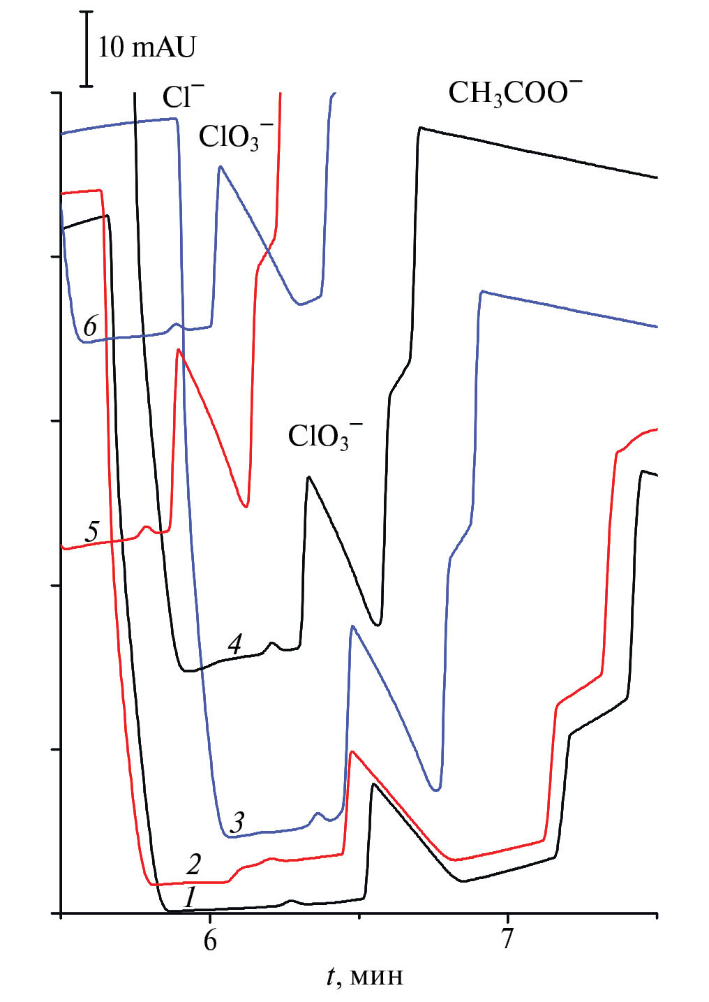 Установлено, что добавка ацетат-ионов в пробу до концентрации 5 мМ эффект стэкинга не вызывает: форма пика хлорат-ионов не изменяется в присутствии в пробе ацетат-ионов (без ввода зоны ацетат-ионов после зоны пробы). Это, вероятно, связано с недостаточным временем ввода ацетат-ионов в капилляр. В этом случае оно равно времени ввода пробы, а для получения неискаженного пика время ввода зоны ацетат-иона должно быть в 20 раз больше (рис. 2, электрофореграмма 6).