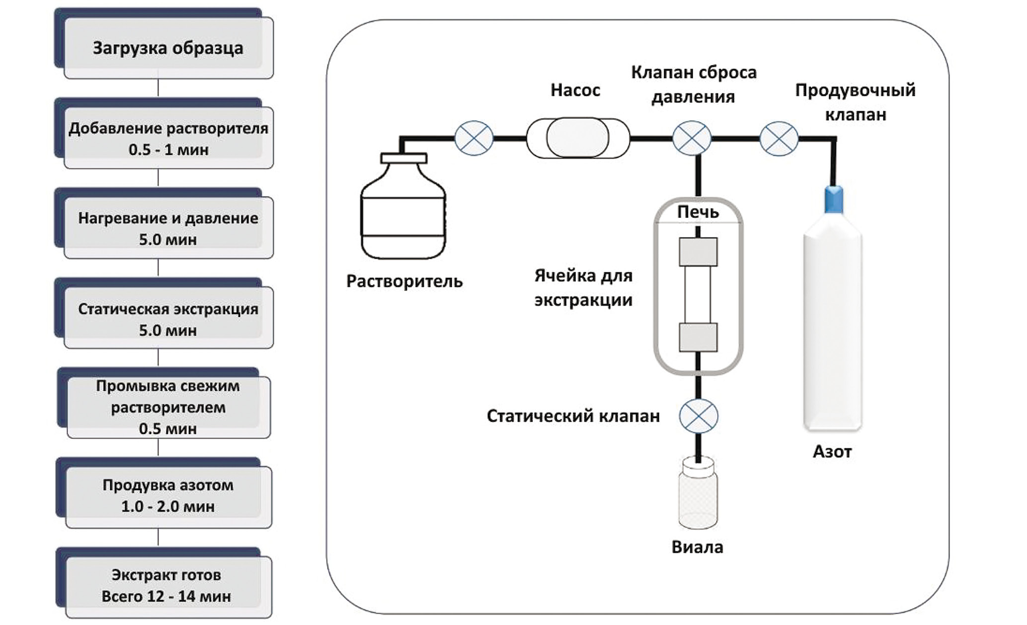 Процедура жидкостной экстракции под давлением подробно описана в нескольких обзорах [26, 28, 30, 33, 35, 36, 44]. Она включает диспергирование образца инертным материалом; помещение смешанного образца в стальную экстракционную ячейку; заполнение ячейки органическим растворителем; нагрев сосуда (обычно до 75–200°C) и повышение давления до установленного значения (обычно до 100 атм); экстракцию целевых аналитов в течение определенного времени; перенос экстракта во флакон для сбора и очистку пробы свежим растворителем; удаление остатков растворителя из пробы путем продувания ячейки газообразным азотом (рис. 1). Конфигурация базового оборудования для проведения ЖЭД зависит от того, является ли процесс статическим с использованием фиксированного объема экстрагента или динамическим, когда экстрагент подается непрерывно через экстракционную ячейку в течение всего времени экстракции. Большая часть оборудования, работающего в автоматическом режиме, позволяет загружать до 24 ячеек, объем которых может изменяться от 1 до 100 мл, причем чаще всего применяют ячейки объемом 33 мл. В настоящее время системы для проведения жидкостной экстракции под давлением предлагаются тремя поставщиками: “Thermo Scientific” (США) (система ускоренной экстракции растворителем, ASE, ранее Dionex); “Fluid Management Systems, Inc.” (США) (FMS) (система PLE); и “Büchi” (Швейцария) (система Speed Extractor) [40].