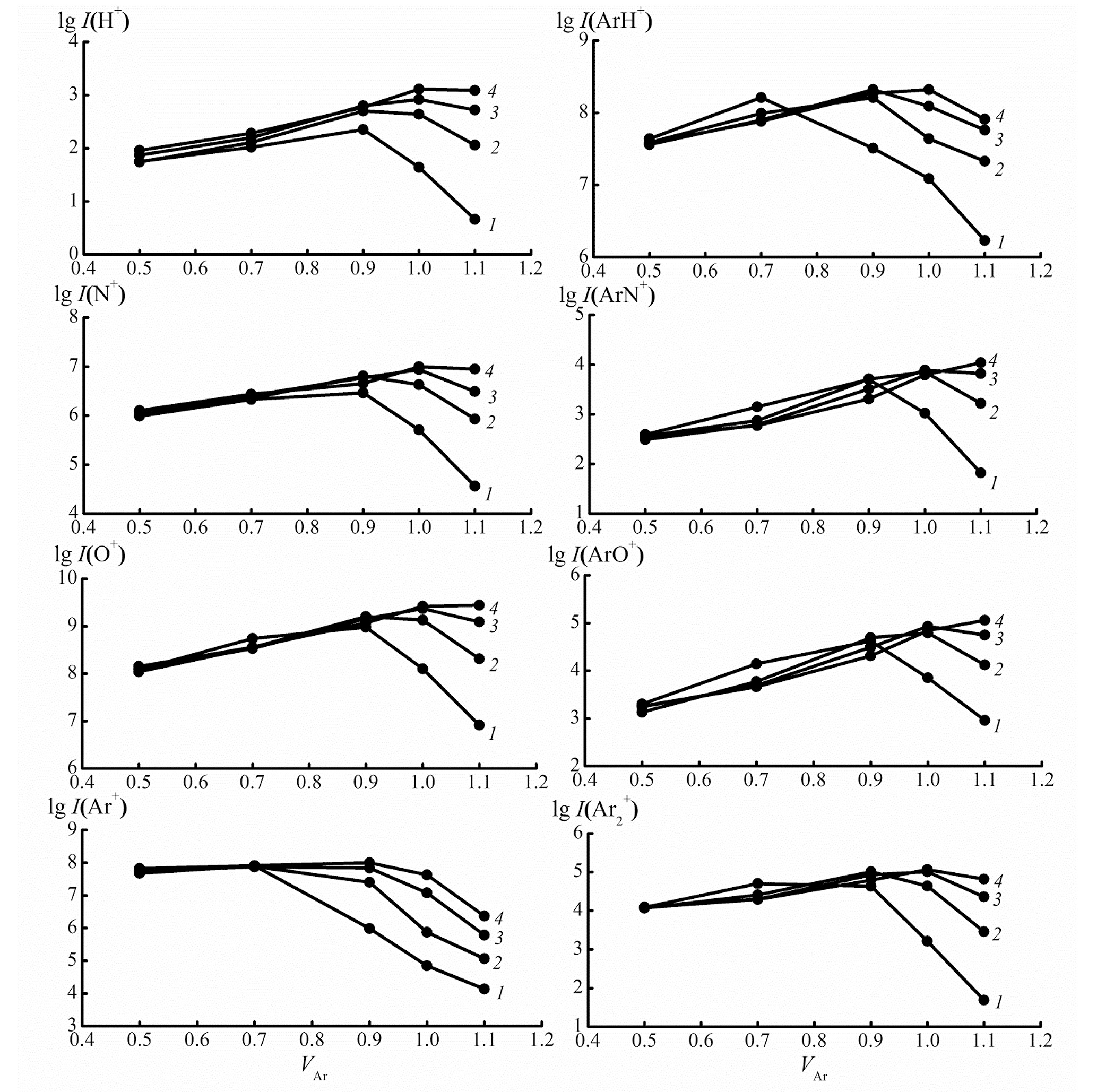 Рис. 1. Экспериментальное изменение логарифмов интенсивности I(X+) (имп/с) основных фоновых ионов ИСП (скорректированные, кроме H+, на эффект дискриминации ионов по массе) в зависимости от скорости транспортирующего потока аргона VAr (л/мин) и высокочастотной мощности плазмы W, Вт: 1 – 800, 2 – 1000, 3 – 1200, 4 – 1400.