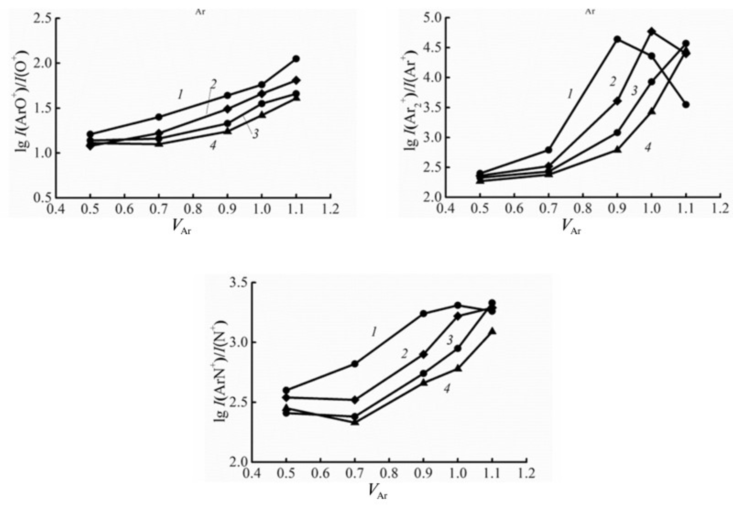 3. Fig. 2. Experimental change in the logarithms of the efficiency of formation of the main background argide ions of the ICP I(ArM+)/I(M+) depending on the speed of the transporting argon flow VAr (l/min) and the high-frequency plasma power, W: 1 – 800, 2 – 1000, 3 – 1200, 4 – 1400.