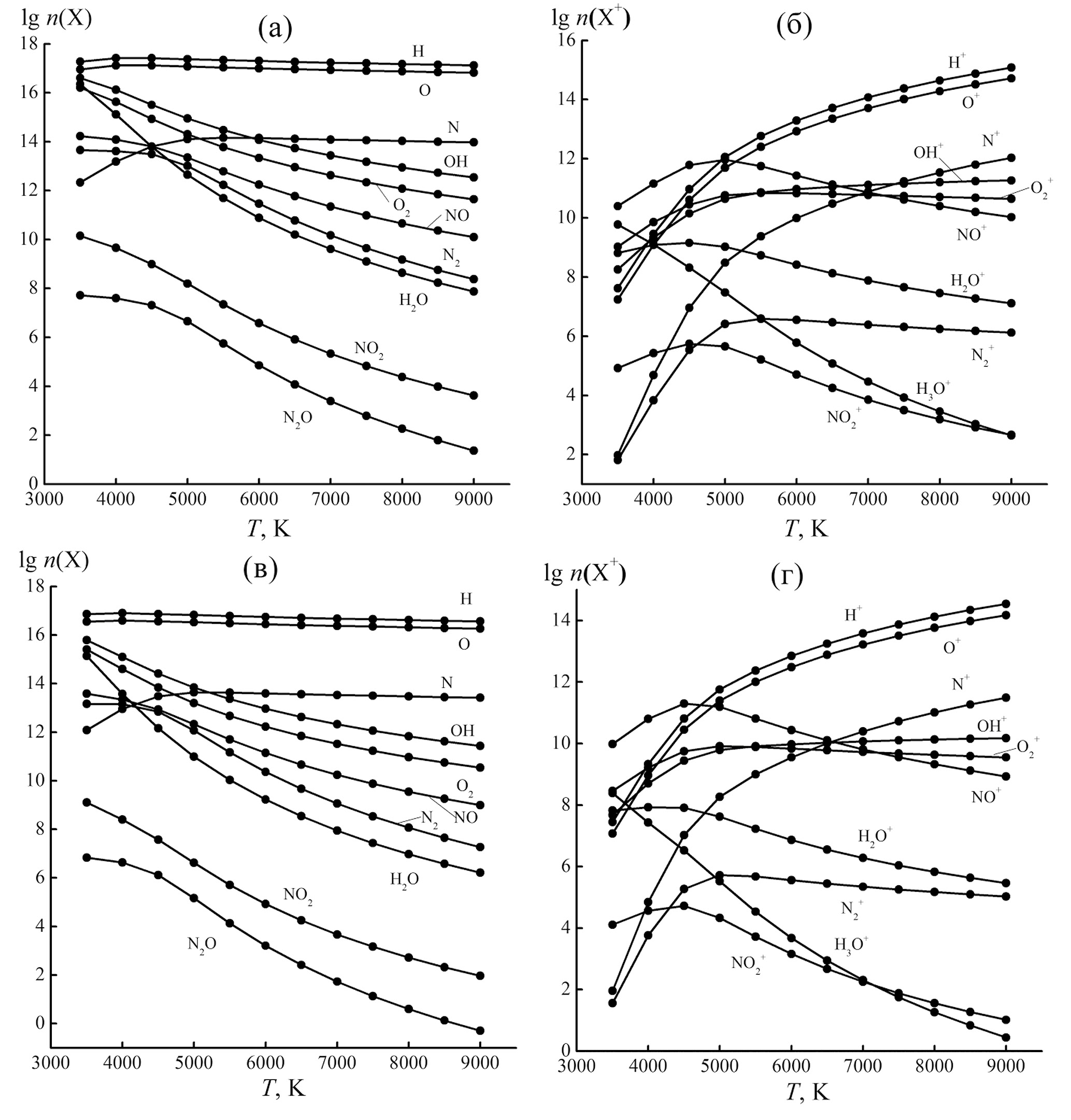 На рис. 3 и 4 приведено расчетное изменение логарифмов концентрации (cм–3) нейтральных частиц n(X) и их фоновых ионов n(X+), включая аргонсодержащие, в ИСП в зависимости от температуры T (К) при расходах транспортирующего потока аргона VAr = 0.22 и 1.0 л/мин. Расчеты показали, что в составе ИСП во всем рассмотренном диапазоне температур основными компонентами являются нейтральные атомарные Ar, H, O и N (рис. 3a, в; 4a, в), поскольку степень их ионизации является достаточно низкой из-за высоких первых потенциалов ионизации данных атомов. Наблюдаемое на графиках небольшое снижение концентрации данных атомов с ростом температуры обусловлено преимущественно температурным расширением газов ИСП. Концентрации всех полиатомных нейтральных частиц, в том числе и аргонсодержащих (кроме ArN), снижаются с ростом температуры, что соответствует их температурной диссоциации. Только для частиц ArN в диапазоне температур 3500–5000 К прослеживается рост концентрации на порядок величины, достижение максимума, а затем ее снижение. Изменение скорости транспортирующего потока аргона в пять раз (от 0.22 до 1.0 л/мин) практически не изменяет все описанные зависимости.
