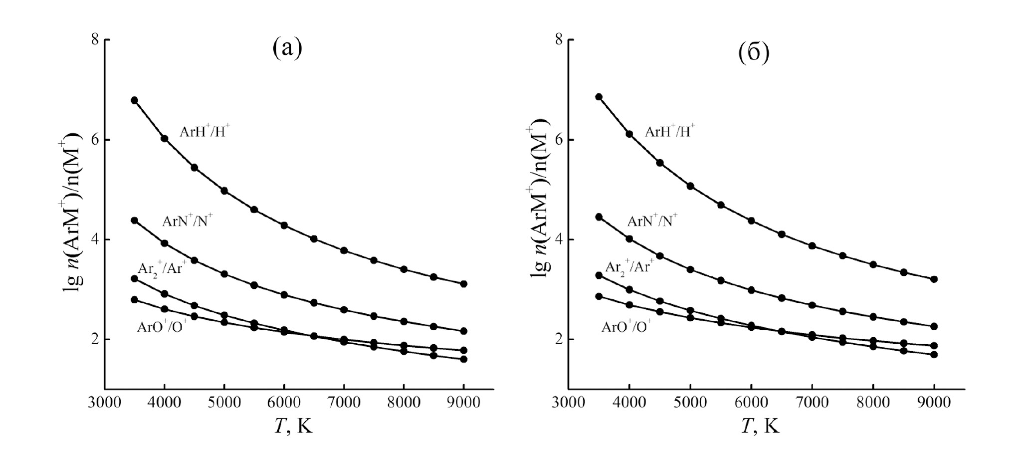 Таким образом, используя данную модель и указанные выше расчетные средства, можно получать информацию при каждой из заданных температур о полном равновесном составе ИСП, включая основные фоновые положительные ионы (H+, H2+, H3+, N+, NH+, O+, OH+, H2O+, H3O+, Ar++, N2+, NO+, O2+, Ar+, ArH+, NO2+, ArN+, ArO+ и Ar2+), находящиеся в равновесии с остальными компонентами плазмы. Это дает возможность рассчитать значения концентраций данных ионов и эффективности образования ArM+/M+ однозарядных аргидных ионов водорода, азота, кислорода и аргона в условиях варьирования температурного и химического состава плазмы. Затем, учитывая, что регистрируемый в масс-спектрометре ионный ток любого типа ионов, несущих элементарный заряд, пропорционален количеству его частиц, попавших после масс-анализатора на фотоэлектрический приемник, можно проводить прямое сопоставление экспериментальной скорости счета ионных импульсов (имп/с) с расчетными концентрациями ионов в плазме разряда (см–3).