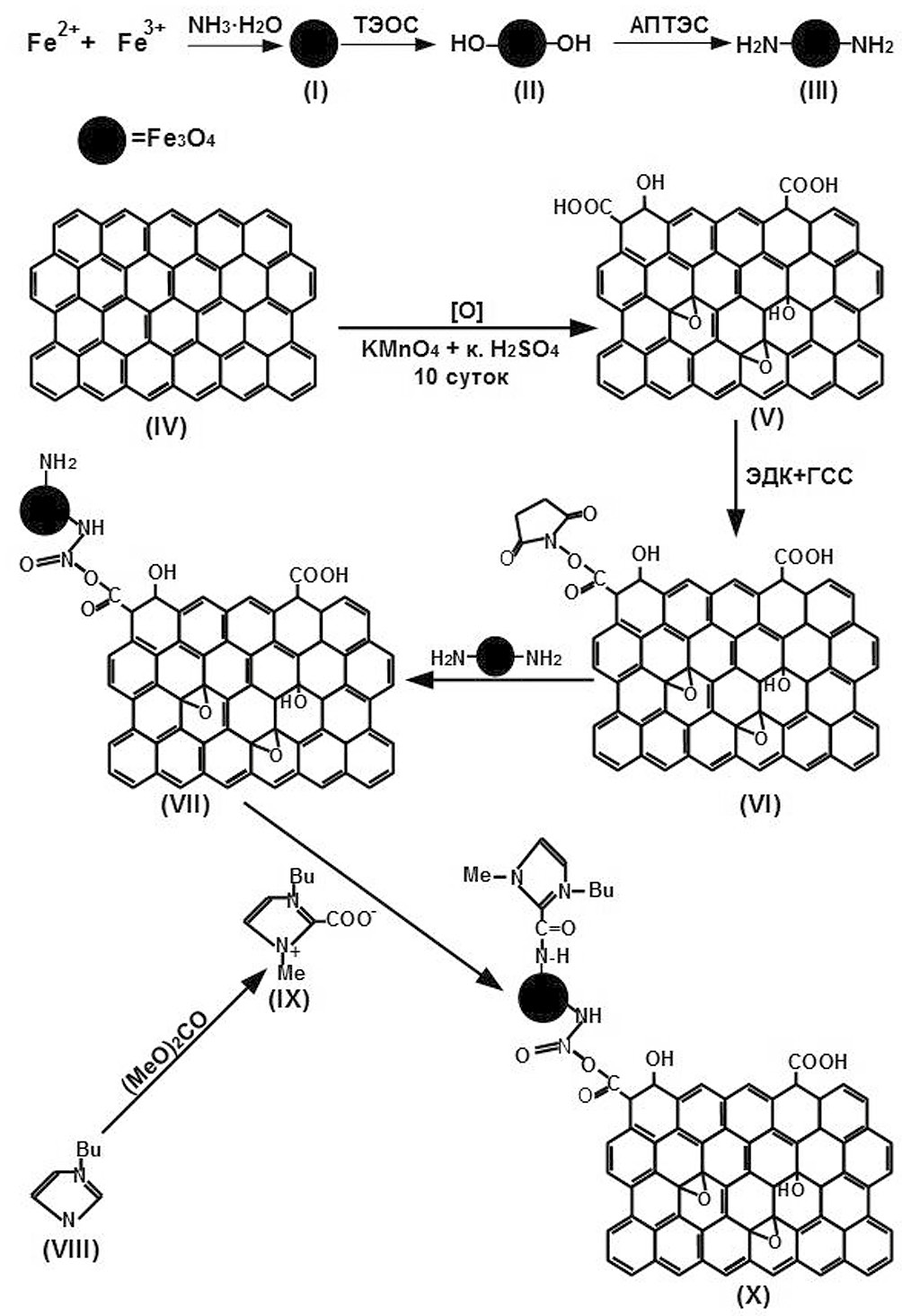 Рис. 1. Схема синтеза сорбента BuImCO2-ОГ-СО-NH-Fe3O4: получение наночастиц Fe3O4 (I); модификация поверхности ОН-группами (II) и NH2-группами (III); окисление графита (IV) до оксида графена (V); модификация ГСС (VI) и ЭДК с получением ОГ-СО-NH-Fe3O4 (VII); получение BuImCO2 (IX) по реакции BuIm (VIII) c диметилкарбонатом; получение BuMeImCO2-ОГ-СО-NH-Fe3O4 (Х) при взаимодействии ОГ-СО-NH-Fe3O4 и BuImCO2.