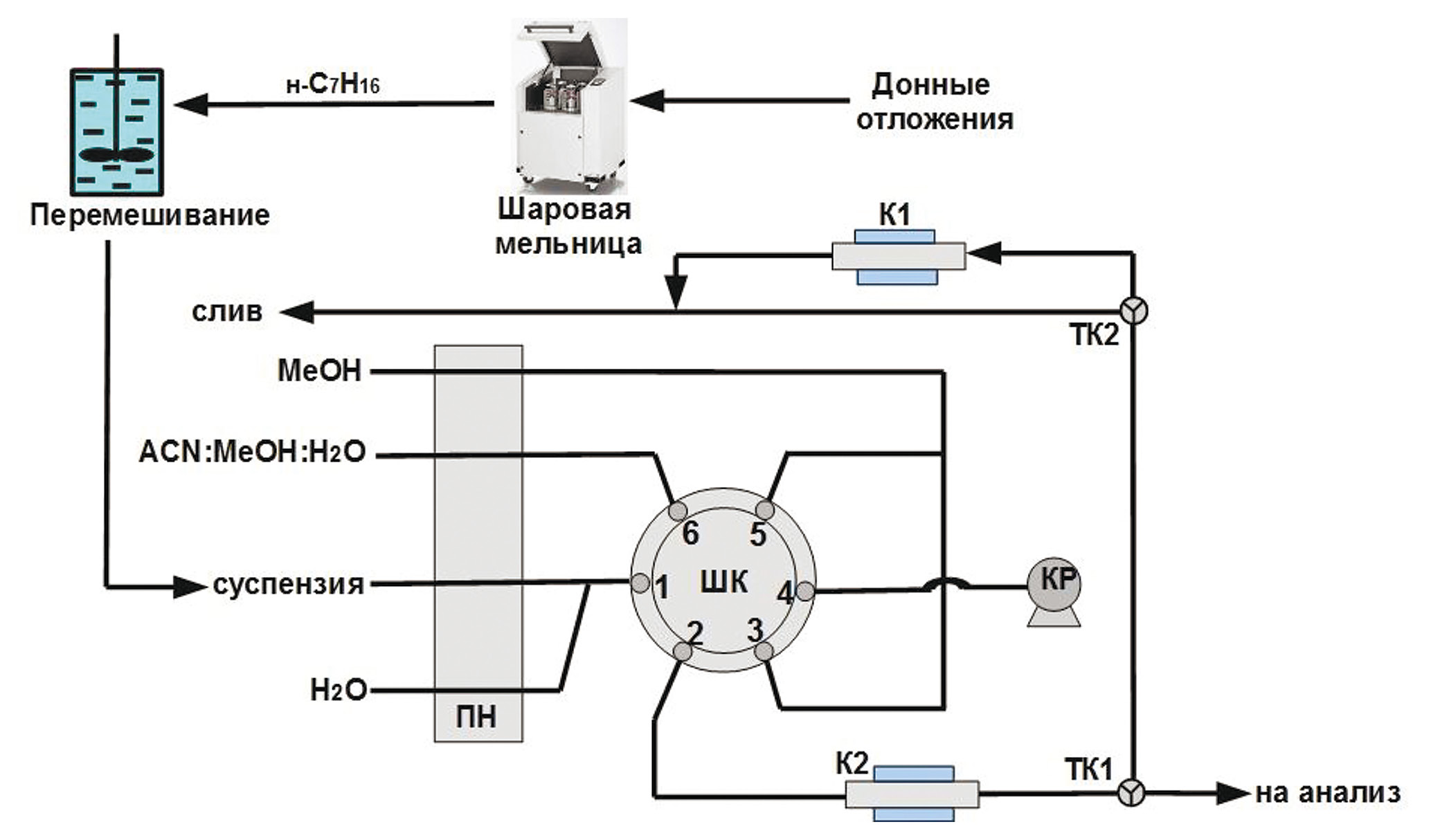 Автоматизированная процедура концентрирования. Для концентрирования предложена автоматизированная система (рис. 2), состоящая из многоканального перистальтического насоса (ПН), двух колонок (К1 и К2 к которым подводятся и отводятся неодимовые магниты с помощью сервопривода с манипулятором. Все части системы соединены силиконовыми трубками с внутренним диаметром 1.8 мм. Управление потоками осуществляется посредством шестиходового крана (ШК) и трехходовых кранов (ТК1, ТК2). Позиции ШК при различных режимах работы представлены на рис 3. Воздух в систему подается компрессором (КР). Суспензия, полученная после обработки ДО в шаровой мельнице и перемешивания в н-гептане, подается через ШК в колонку К2, где магнитный сорбент извлекается из потока суспензии магнитами. Суспензия без магнитного сорбента отправляется на слив. Для десорбции БФА метанол (1 мл) из емкости через ШК направляется в колонку К1. Метанольный экстракт после десорбции упаривали до объема 0.1 мл в слабом токе азота и анализировали методом ГХ-МС. После десорбции сорбент в колонке промывали смесью ацетонитрил–метанол–вода (5 : 5 : 1, по объему), затем водой. После промывки неодимовые магниты отводились от колонки К2 и из компрессора (КР) подавали сжатый воздух. Регенерированный сорбент из колонки К2 направляли в съемную колонку К1, где он задерживался магнитным полем, создаваемым двумя магнитами. Колонку вынимали, извлекали сорбент для повторного использования.