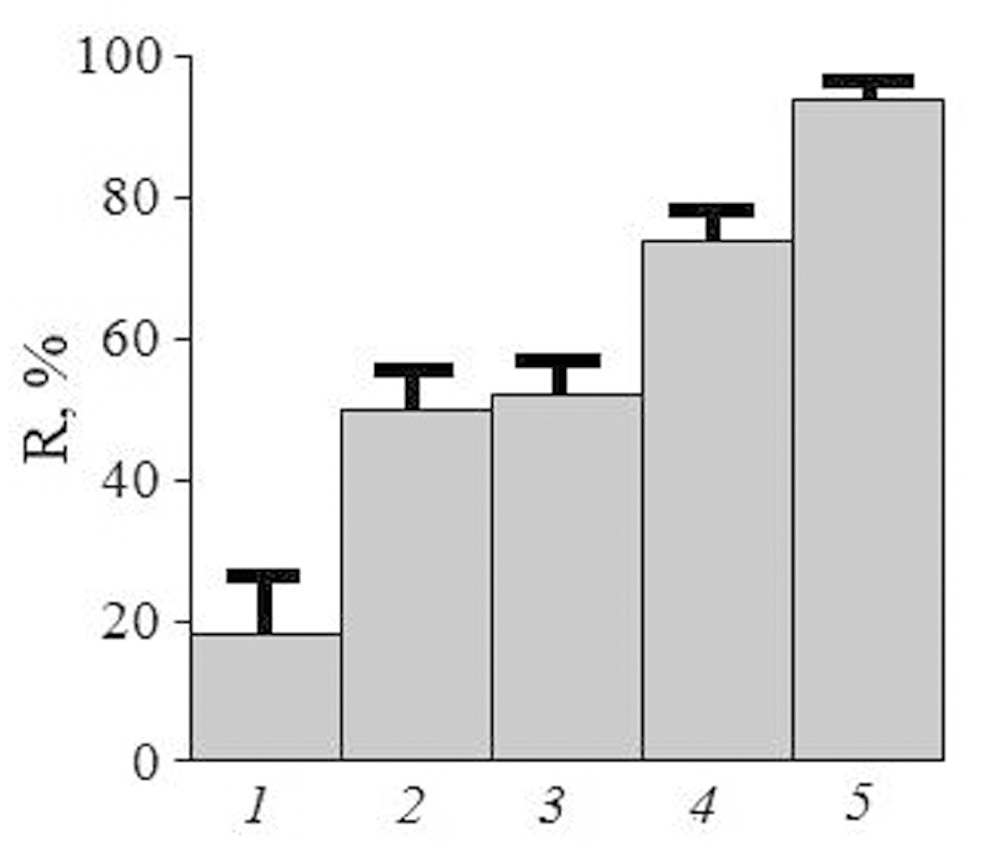 Рис. 8. Эффективность извлечения бисфенола А из донных отложений методом матричного твердофазного диспергирования с применением Fe3O4 (1), Fe3O4@SiO2 (2), Fe3O4@SiO2-NH2 (3), GO-СО-NH-Fe3O4 (4), BuMeImCO2-GO-СО-NH-Fe3O4 (5).