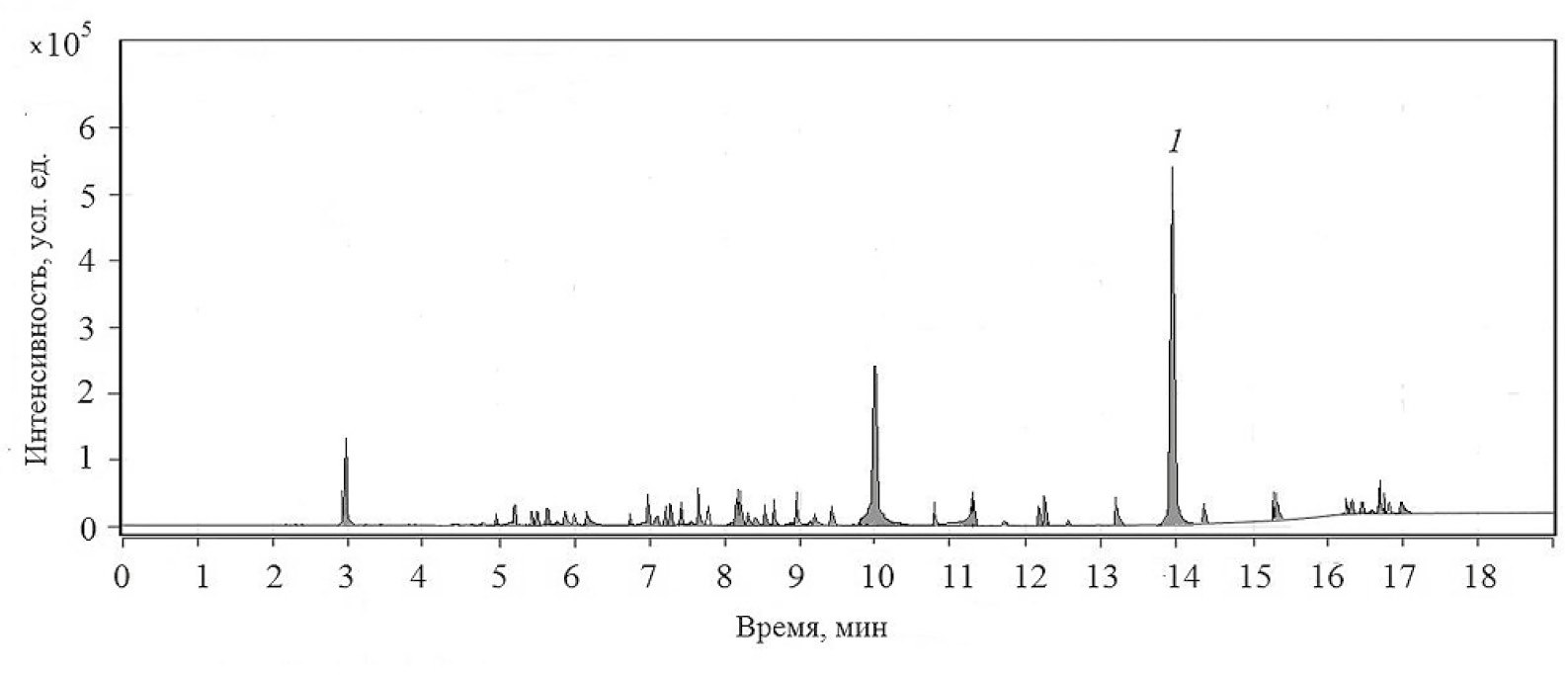 Рис. 9. Хроматограмма образца донных отложений (цифрой 1 обозначен пик бисфенола А).