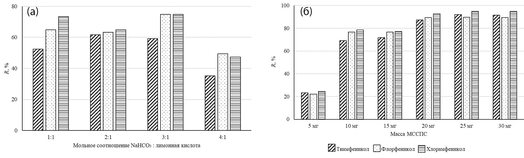 Рис. 1. Степени извлечения амфениколов в зависимости от мольного соотношения гидрокарбоната и лимонной кислоты (а) и содержания МССПС (б) в составе таблеток для МТФЭ-СО2. V = 25 мл, mМССПС = 10 мг (а), мольное соотношение NaHCO3 : C6H8O7 3 : 1 (б).
