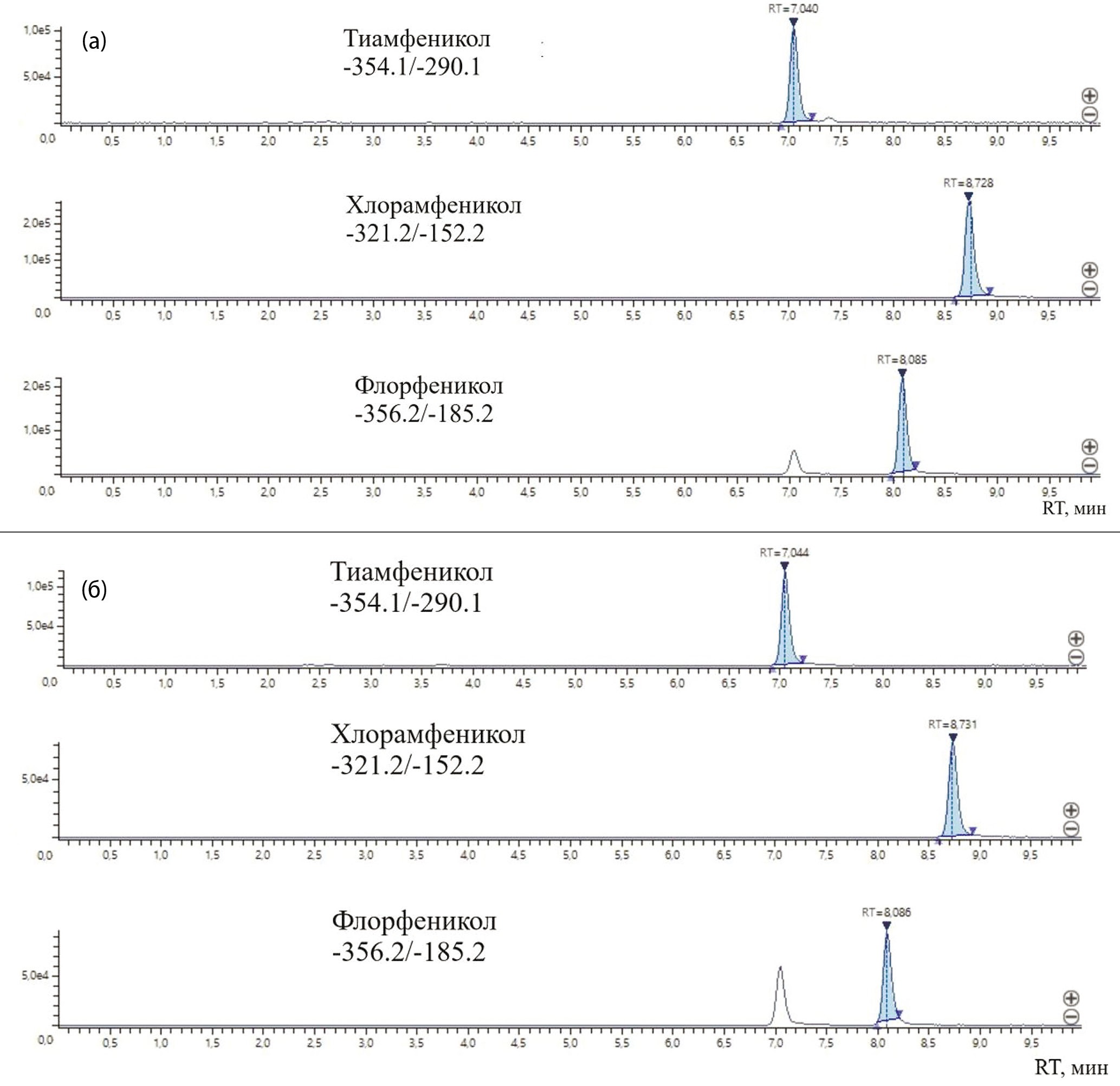 Рис. 2. Масс-хроматограммы по выделенным ионам экстрактов меда (а) и молока (б) с добавлением 100 и 8 мкг/кг амфениколов соответственно после очистки методом магнитной твердофазной экстракции с диспергированием магнитного сверхсшитого полистирола углекислым газом.