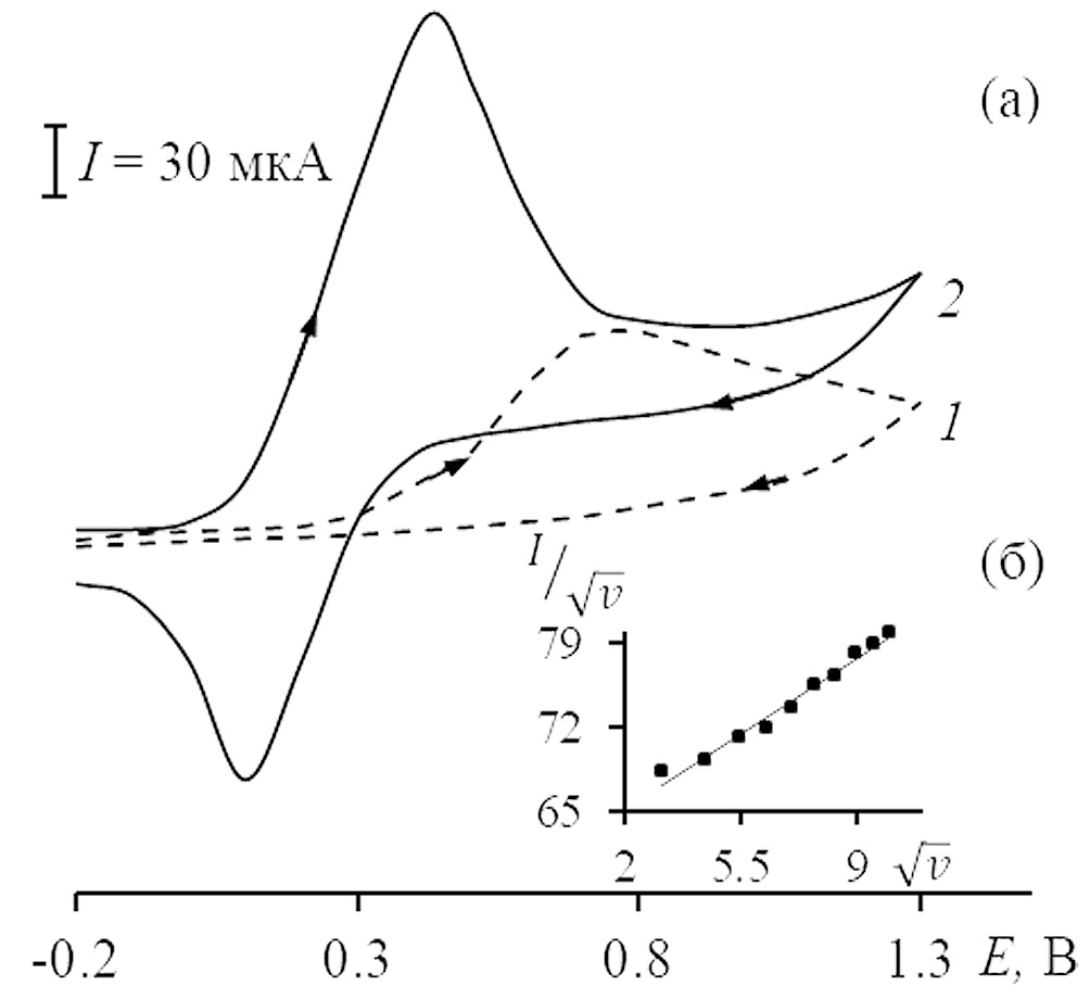 Циклические вольтамперограммы (ЦВА) регистрировали с помощью бипотенциостата DropSens μSTAT400 (Испания) с трехэлектродной электрохимической ячейкой объемом 10 мл, в которой рабочим электродом являлся СУЭ. В качестве электрода сравнения и вспомогательного электрода применяли хлоридсеребряный и платиновый электроды соответственно. Циклические вольтамперограммы регистрировали при скорости наложения потенциала (v) 10–100 мВ/с.