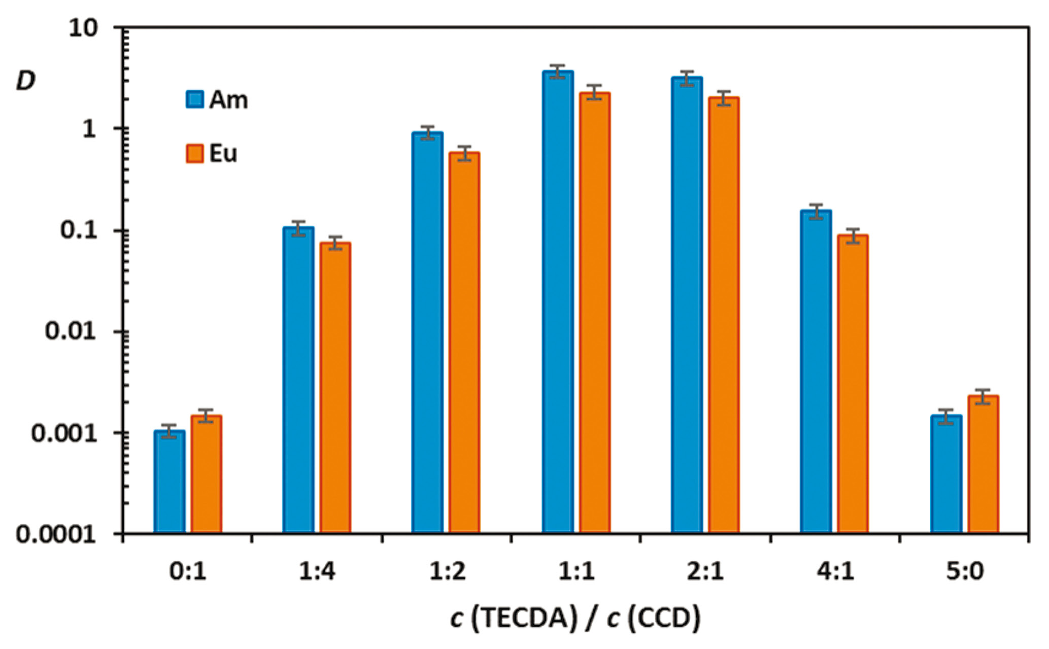 Изучали экстракцию металлов из азотной кислоты при различном соотношении ХДК и TECDA в органической фазе. На рис. 1 показана зависимость коэффициентов распределения Am и Eu от состава органической фазы. Наибольший коэффициент распределения достигается при соотношении концентраций TECDA и ХДК 1 : 1.
