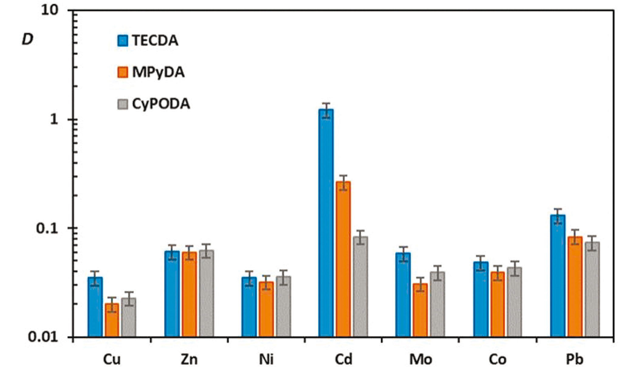Экстракция d-элементов из HNO3. Изучали экстракционную способность новых экстрагентов по отношению к d-элементам из 3 М HNO3 0.1 М растворами лиганда в Ф-3. Данные для TECDA, MPyDA и CyPODA представлены на рис. 2. Экстракционная способность DOPDA по отношению к d-элементам оказалась очень низкой: значения коэффициентов распределения металлов не превышают 0.01. Видно, что наибольшую экстракционную способность TECDA проявляет по отношению к Cd и Pb, в то время как MPyDA заметно извлекает только Cd. Коэффициенты распределения остальных металлов ниже 0.1. На примере Cd и Pb видно, что экстракционная способность лигандов уменьшается в ряду TECDA > MPyDA > CyPODA.