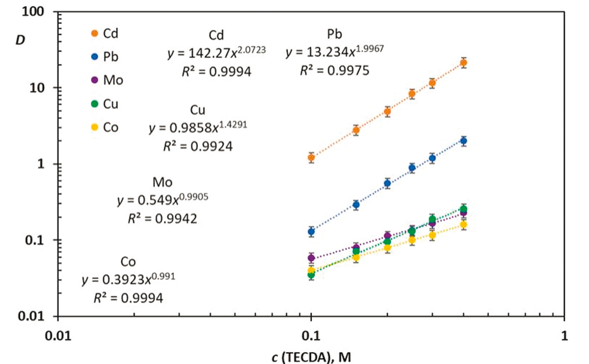 Рис. 3. Зависимость коэффициентов распределения металлов от концентрации TECDA в Ф-3. Водная фаза – 3 M HNO3, cMe = 0.0002 M.