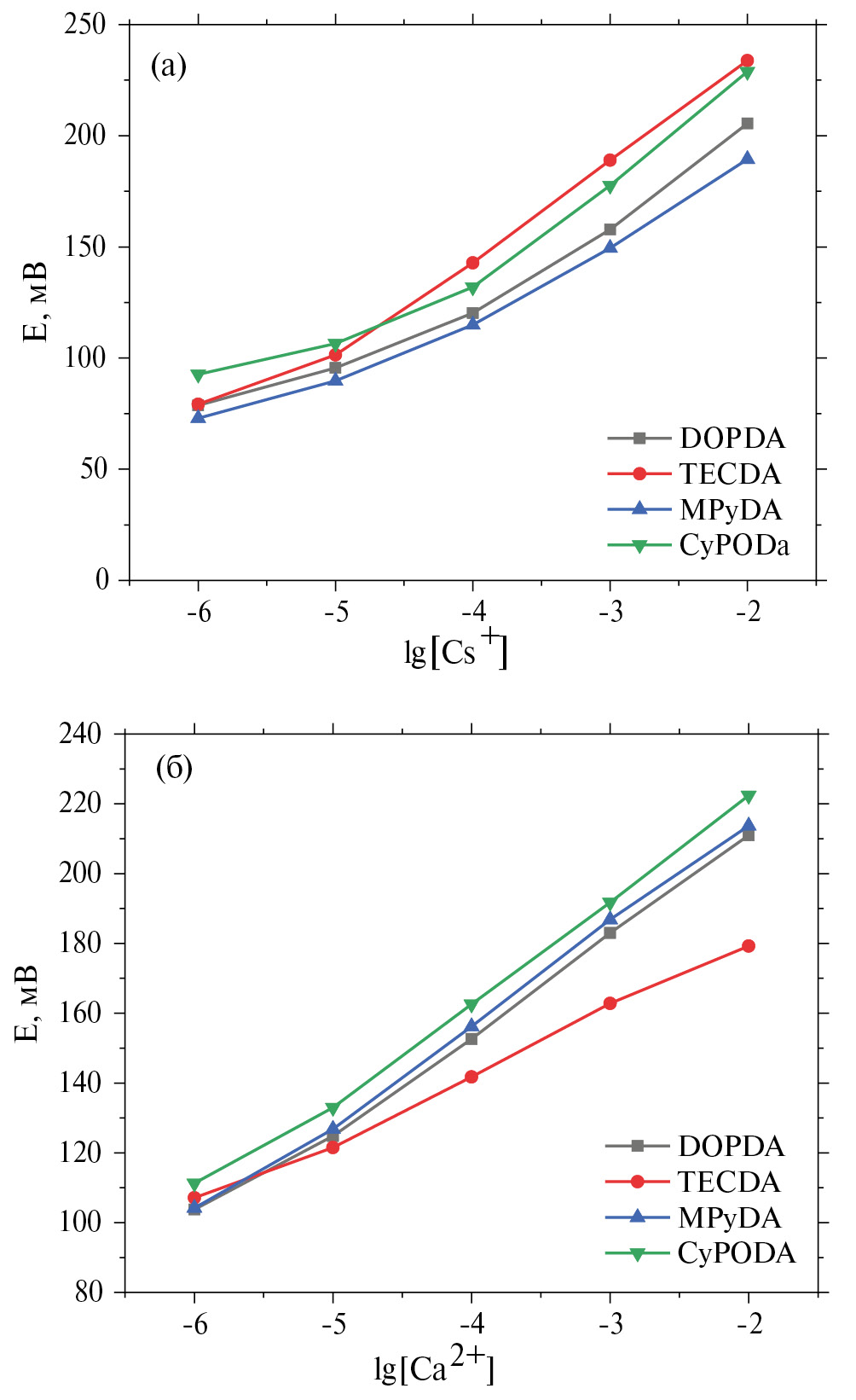 Рис. 5. Кривые потенциометрического отклика в водных растворах. (a) − Cs+, (б) − Ca2+.