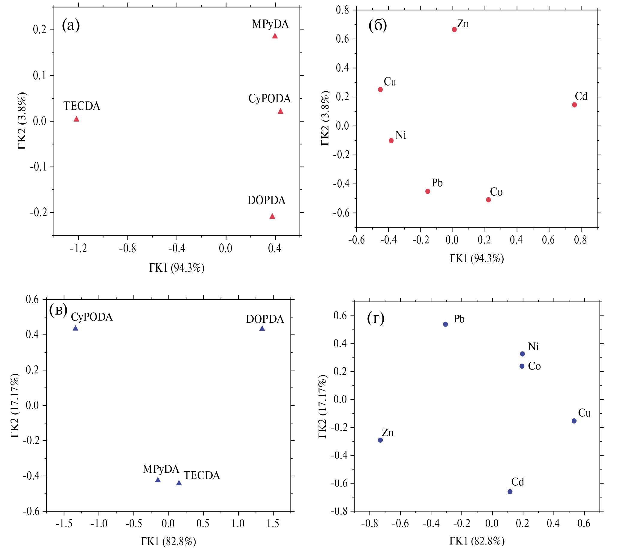 На рис. 7 представлены результаты применения МГК в виде графиков счетов и нагрузок для изученных лигандов, рассчитанных по чувствительности сенсоров к переходным металлам (рис. 7а, б) и по экстракционной способности изученных лигандов (коэффициенты распределения переходных металлов, рис. 7в, г). Графики счетов (рис. 7a, c) позволяют удобно визуализировать сходства и различия в поведении лигандов как при потенциометрических измерениях, так и при экстракции. Причем расположение точек на графике рядом друг с другом указывает на сходство образцов (лигандов), а большое расстояние между ними – на их различия. Как видно из рис. 7а, сенсоры на основе лигандов MPyDA, CyPODA и DOPDA (по ГК1) имеют схожие характеристики чувствительности к некоторым двухзарядным катионам, в то время как сенсор на основе TECDA (по ГК1) значительно отличается от остальных. Наибольший вклад в это различие вносят катионы Cd2+, Cu 2+ и Ni 2+ (рис. 7б). Эти данные хорошо согласуются с результатами, представленными на рис. 6б, где сенсор на основе TECDA демонстрирует наибольшую чувствительность к Cu2+, Ni2+ и наименьшую к Cd2+ по сравнению с другими разработанными сенсорами. В отношении ГК2 наблюдается различие между сенсорами на основе MPyDA и DOPDA, что объясняется разной чувствительностью этих сенсоров к катионам Zn2+, Co2+ и Pb2+. Действительно, сенсор на основе DOPDA имеет более высокую чувствительность к Co2+ и Pb2+ и низкую чувствительность к Zn2+ по сравнению с сенсором на основе MPyDA.