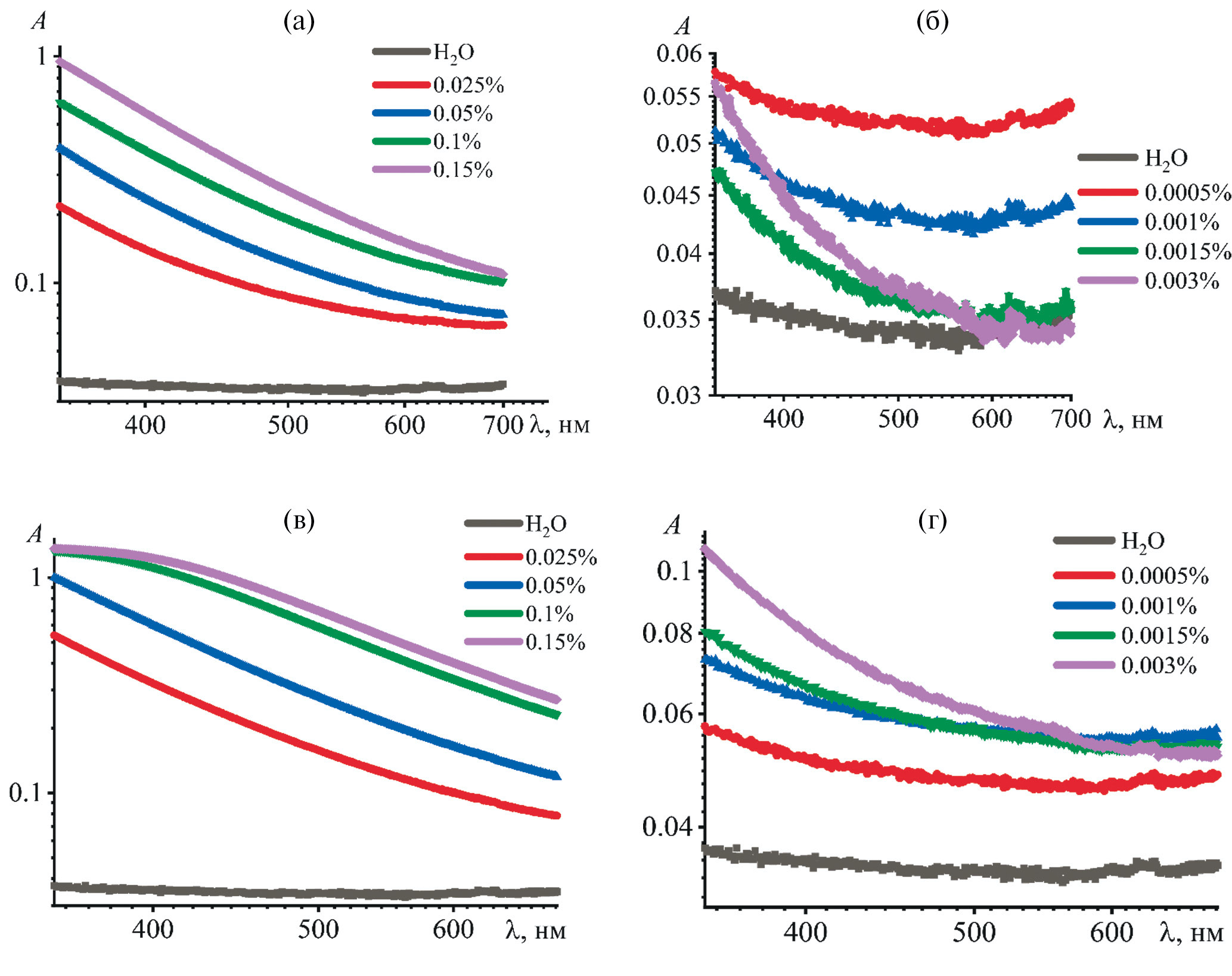 Рис. 2. Оптические спектры поглощения дисперсий полистирола (без обработки), где: (а) образец MD-11, (б) MD-11-R, (в) MD-10, (г) MD-10-R.