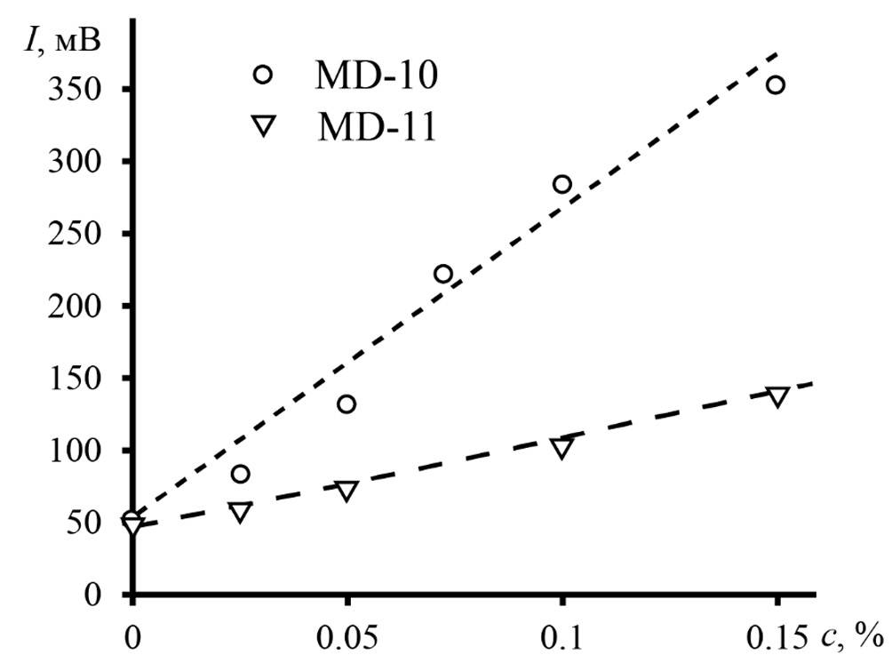 Анализ спектров светопоглощения водных растворов частиц полистирола показал, что дисперсии имеют значительное светорассеяние при 532 нм. На рис. 2 представлены электронные спектры исследуемых образцов. Результаты измерения светорассеяния при помощи термолинзового спектрометра показали, что дисперсия MD-10 (80 нм) характеризуется ожидаемо бóльшим светорассеянием в сравнении с MD-11 (65 нм) при тех же массовых концентрациях (рис. 3).