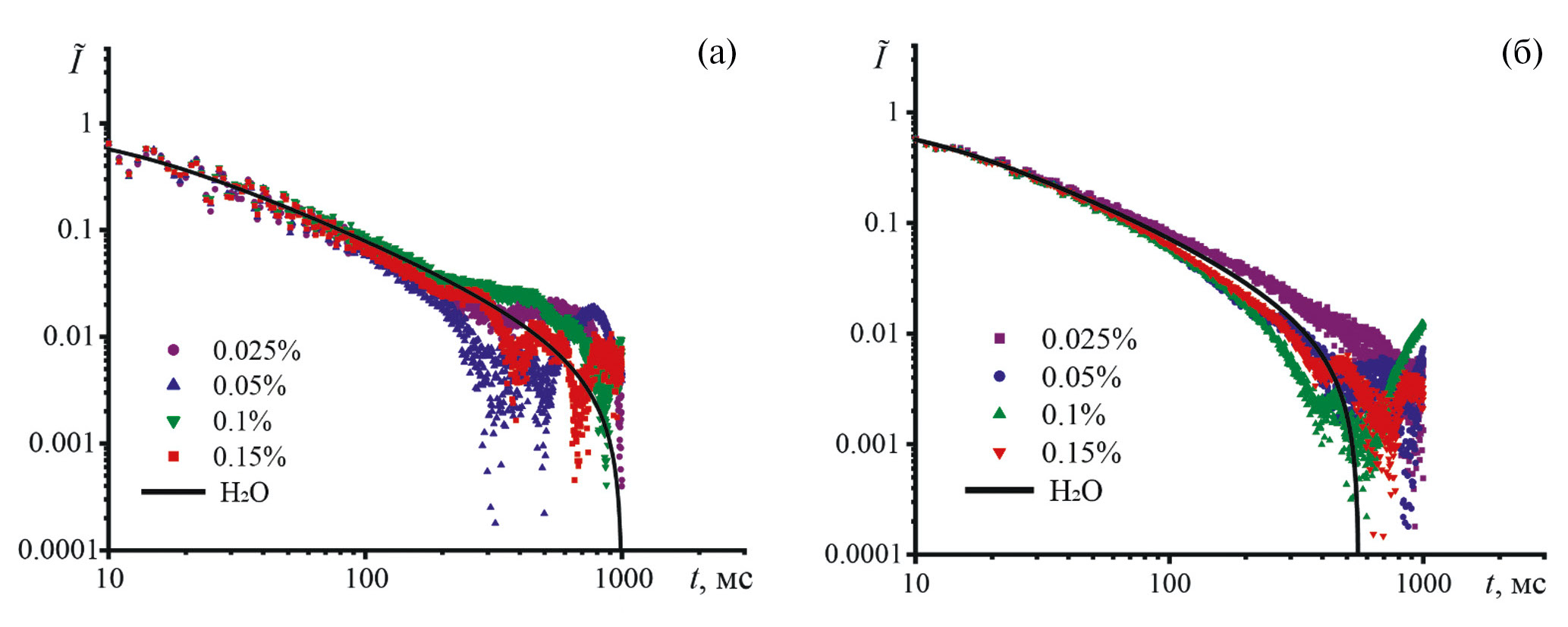 Рис. 9. Времяразрешенные кривые для различных типов наночастиц полистирола при разной концентрации, где (а) MD-10-R, (б) MD-11-R. Длина волны 532 нм, мощность излучения 300 мВт.