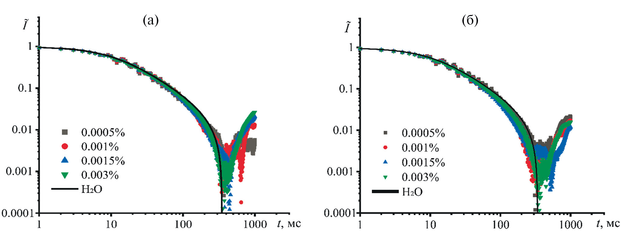 Анализ агрегативной устойчивости с применением просвечивающей электронной спектроскопии и фотонной корреляционной спектроскопии в течение 14 суток не выявил изменений в размере наночастиц. При этом электрокинетические потенциалы частиц стабильны, близки и составляют более 70 мВ по модулю (табл. 2), что значительно превосходит порог агрегативной устойчивости коллоидных систем (> |30| мВ) [50]. Таким образом, можно исключить агрегацию частиц и ее влияние на сигнал [18], т.е. поведение времяразрешенного сигнала может быть вызвано только причинами, указанными выше. Однако в рамках проведенной работы невозможно пока количественно проверить или опровергнуть выдвинутые гипотезы, а указанные предположения имеют только качественный характер.