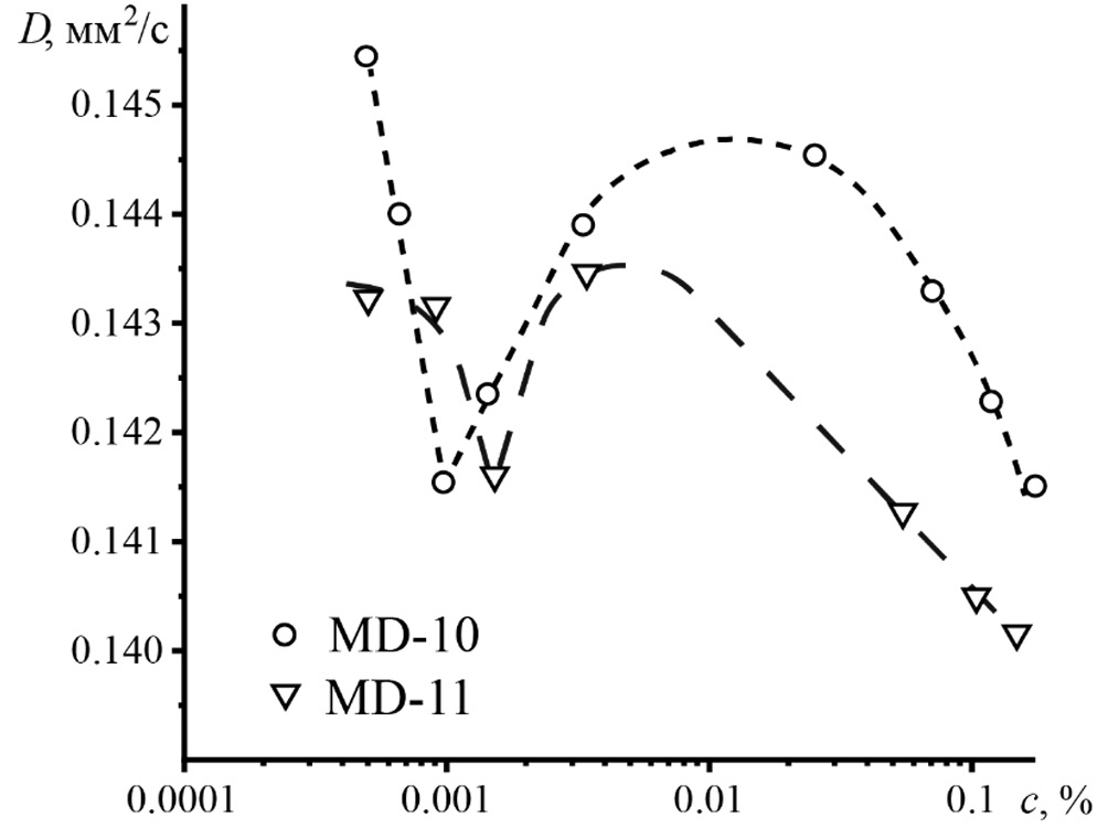 Реже наблюдается уменьшение температуропроводности с ростом содержания нанофазы. Такое поведение характерно для углеродных и аморфных материалов [18, 59], а также флуоресцирующих объектов [41]. Объяснением снижения температуропроводности может быть и снижение интенсивности броуновского движения, и ослабление взаимодействия между частицами и жидкой средой [41]. Другой причиной снижения температуропроводности может быть агрегация и агломерация наночастиц [60]. В растворах наличие нано- и (или) микрофазы на низком уровне массовых концентраций (нано-/микрограмм в литре), как правило, приводит к незначительному уменьшению температуропроводности (около 1–2%). Ранее это явление обнаружено для водных дисперсий оксидов кремния и графена [12, 18].
