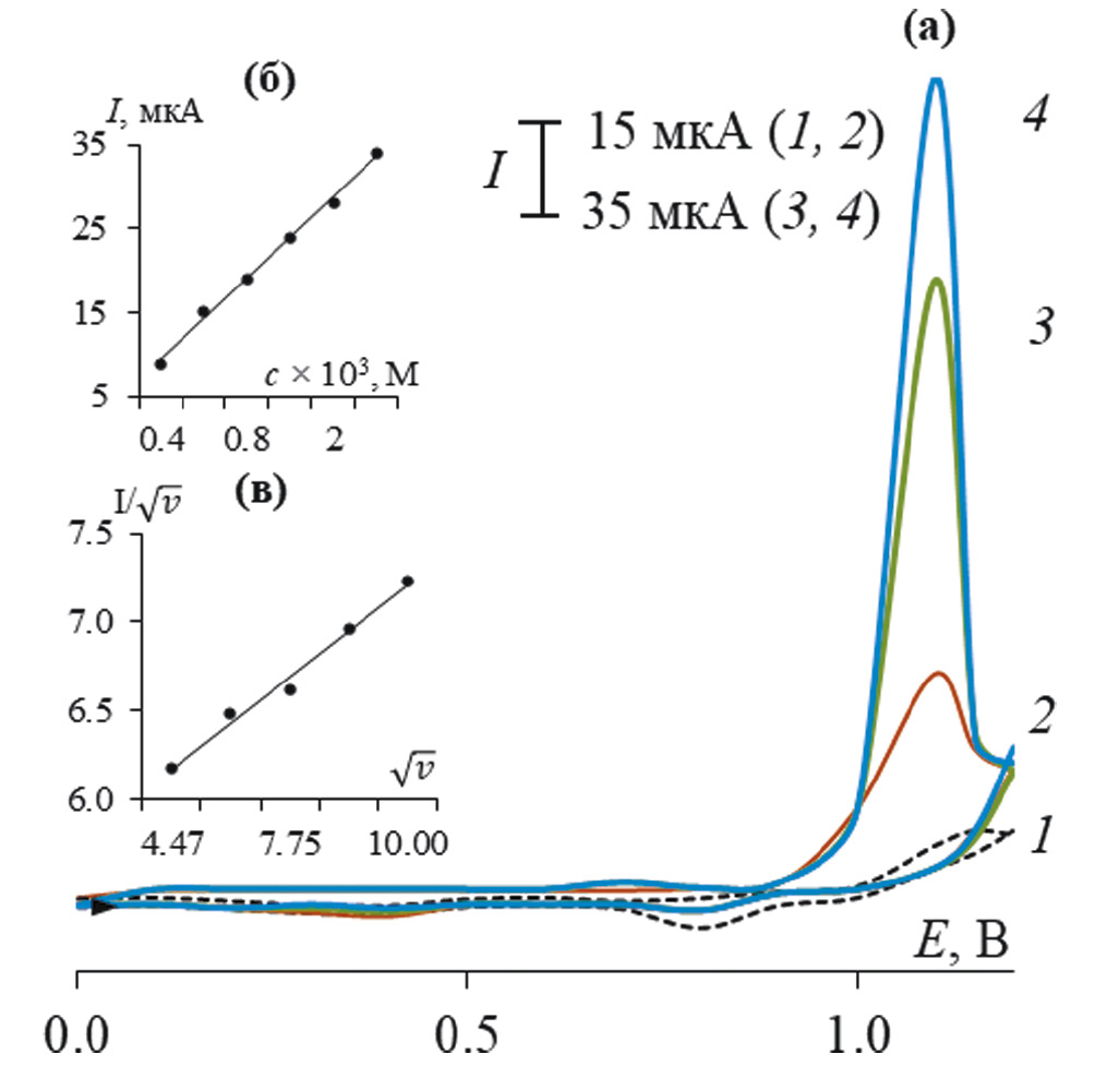 Рис. 1. Циклические вольтамперограммы на электроде Au –СУЭ в отсутствие сульфаметазина (1) и на электродах Au –СУЭ (2), МУНТ–ИЖ–СУЭ (3) и Au –МУНТ–ИЖ–СУЭ (4) в присутствии 5 × 10–3 М сульфаметазина на фоне 0.05 М H2SO4 (а). Зависимость тока при Е 1.10 В от концентрации сульфаметазина (б) и скорости наложения потенциала (в) при его окислении на электроде Au–СУ.