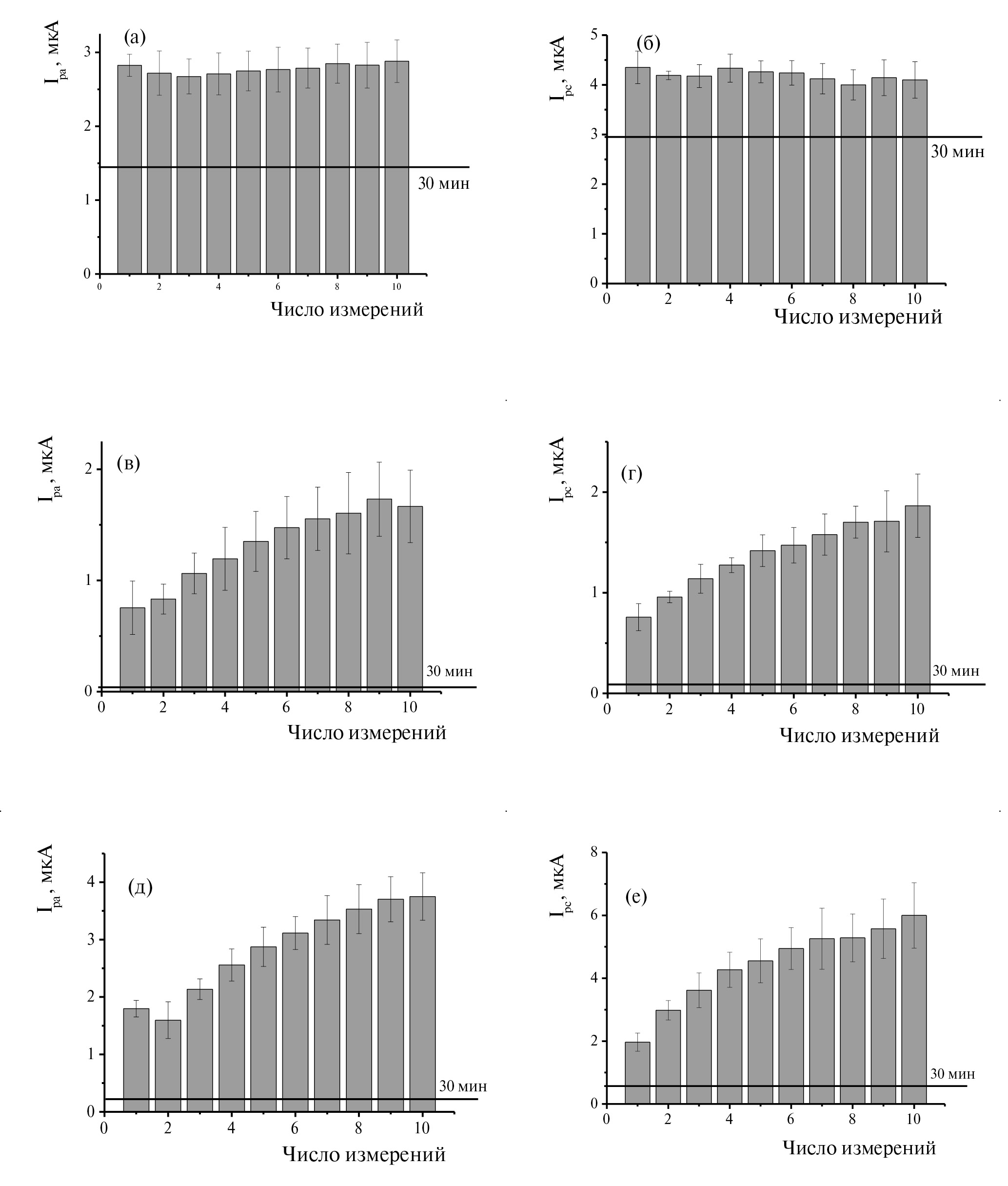 При регистрации десяти последовательных вольтамперограмм из фосфатного буферного раствора покрытие ПАО1 демонстрировало стабильность токов пиков окисления и восстановления (рис. 2а, б). В отличие от покрытия, полученного из водной среды, сигнал покрытий ПАО2 и ПАО3 увеличивался при многократном сканировании потенциала, что свидетельствовало о дополнительной проработке поверхности (рис. 2в–е). Бестоковый режим позволил удалить часть захваченного в процессе роста полимерного покрытия мономера из покрытия ПАО1, что снижало токи по сравнению с первым вариантом стабилизации. В случае ПАО2 и ПАО3 при использовании бестокового режима токи пиков полимера практически исчезали. В дальнейшем для стабилизации покрытия ПАО1 выбрали методику выдерживания покрытия в режиме разомкнутой цепи, а в случае покрытий из ГЭР – десятикратное сканирование потенциала в рабочем буферном растворе.