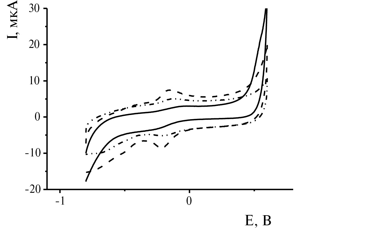 Рис. 3. Циклические вольтамперограммы покрытий ПАО1 (—), ПАО2 (–··), ПАО3 (····) после стабилизации по выбранной методике, 0.1 М фосфатный буферный раствор с рН 7.0, содержащий 0.1 моль/л NaNO3, –0.8 … 0.6 В, 0.15 В/с.