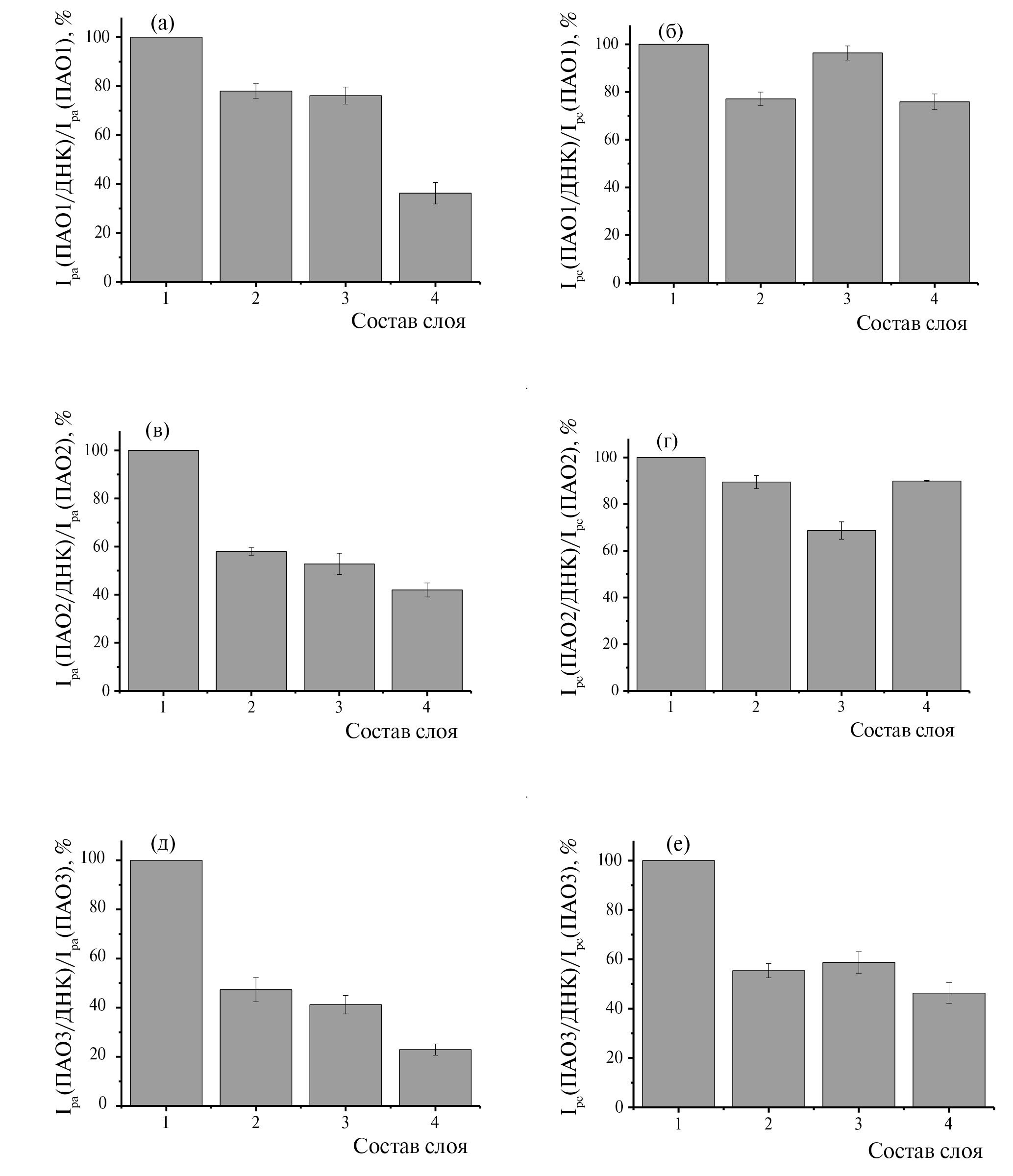 В данной работе для иммобилизации использовали капельное нанесение 2 мкл раствора, содержащего 1 мг/мл ДНК, с последующей физической иммобилизацией биополимера в слое за счет электростатических взаимодействий. Наносимый раствор либо высушивали на рабочей поверхности ПУЭ/ПАО1, ПУЭ/ПАО2 и ПУЭ/ПАО3, либо оставляли под пластиковой пробиркой Эппендорфа для предотвращения высыхания на 10–30 мин с последующей отмывкой деионизованной водой. До и после нанесения ДНК регистрировали циклическую вольтамперограмму в диапазоне –0.8 … 0.6 В при скорости сканирования 0.15 В/с в 0.1 М фосфатном буферном растворе с рН 7.0, содержащем 0.1 моль/л NaNO3. Контролировали изменение пары пиков полимерного покрытия ПАО1–ПАО3. Дополнительных сигналов, характерных для редокс-реакций нуклеотидов ДНК, на вольтамперограмме не наблюдали. Изменение сигнала сенсора после включения ДНК выражали в процентах относительно сигнала редокс-пары полимера без ДНК (рис. 5).