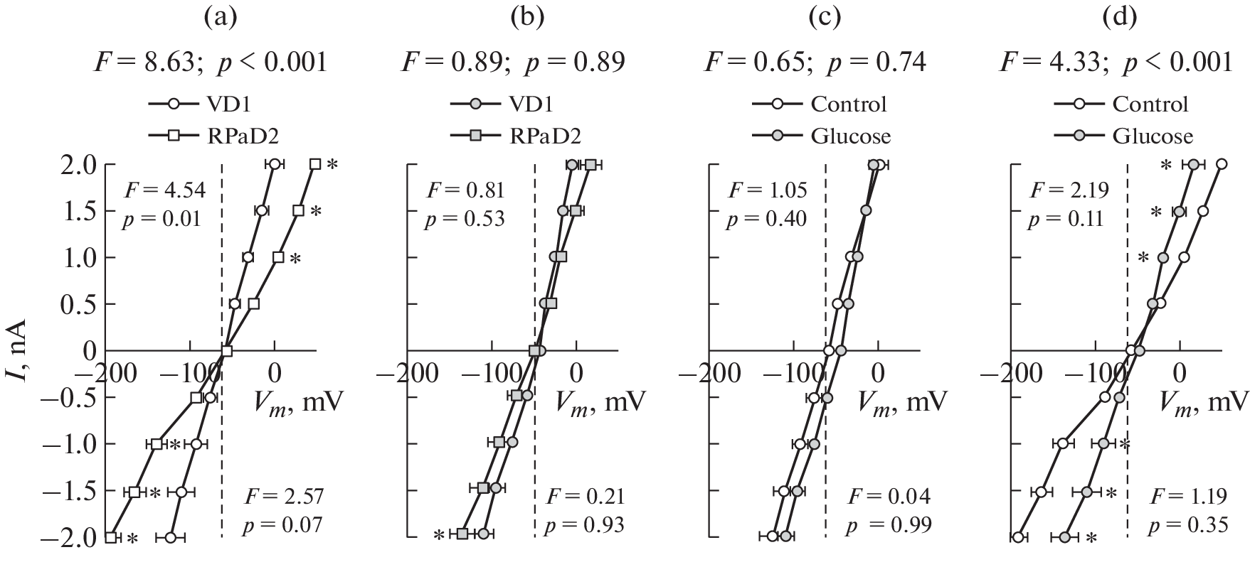 Microelectrode technique was used to study the responses of identified peptide-containing cells VD1 and RPaD2 within isolated CNS of Lymnaea stagnalis to long-lasting (not less 2 h) exposure in D-glucose (10 mM) containing solution. It has been established that electrical characteristics of RPaD2 membrane, compared to VD1, undergo significant changes under experimental hyperglycemia. Decrease of membrane resistance (Rm), accompanied by an increase of membrane capacitance (Cm) and time constant (τm), were observed. Despite the invariance of their firing rate, depolarization of VD1 membrane take place, while RPaD2 membrane potential did not vary significantly. Modifications in time-course, but not amplitude, of VD1 and RPaD2 action potentials were similar and resulted in increase of their main phases (rising, falling, undershoot) duration. It is assumed that “identity” in membrane electrical properties of Lymnaea’s CNS neurosecretory neurons (VD1/RPaD2) at hyperglycemia plays an adaptive role, aimed to overcome the possible desynchronization of their spike activity as a result of electrical decoupling, initiated by a high glucose content in intercellular space.