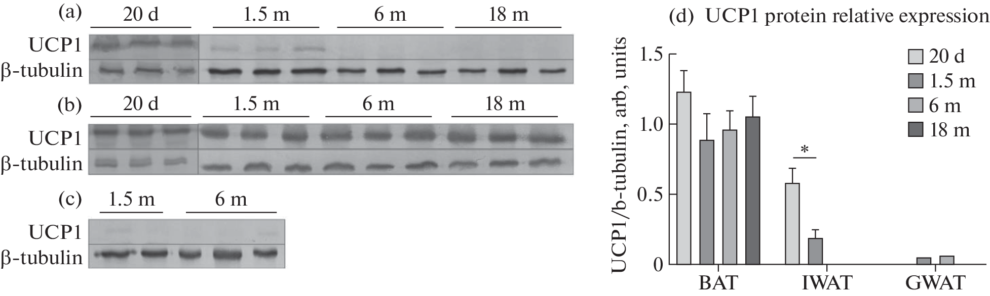 Uncoupling protein (UCP1) uncouples mitochondrial respiration from ATP synthesis, resulting in heat production in brown and beige adipocytes. The presence of adipocytes with UCP1 expression in fat depots has been shown to promote metabolic health and provide protection against metabolic disorders. It stimulates interest in studying the age dynamics of UCP1 expression. There are few data available, mainly obtained on the C57Bl/6J mouse line predisposed to obesity and cover either early or late ontogenesis. In our study, for the first time, the expression of the UCP1 protein in the adipose tissues of male ICR mice was studied from the weaning to old age. Interscapular brown adipose tissue (BAT), inguinal and perigonadal white adipose tissue (IWAT and GWAT) of 20-day, 1.5, 6, 18 months mice were collected. UCP1 levels were detected by western-blotting. IWAT UCP1 expression decreased by 2 times between 20 days and 1.5 months. No UCP1 bands on blots from mice older than 1.5 months were observed. In gonadal depot UCP1 was detected only in 30% of the samples from 1.5- and 6‑months old mice, and UCP1 expression level was ten times lower in compare to inguinal depot. No statistically significant changes in UCP1 protein expression were detected in brown adipose tissue. The physiological role of UCP1-expressing cells in GWAT is discussed, as well as a possible relationship between the timing and rate of UCP1 expression decrease during the growth and maturation of reproductive function with the activation of lipogenesis in inguinal adipose tissue.